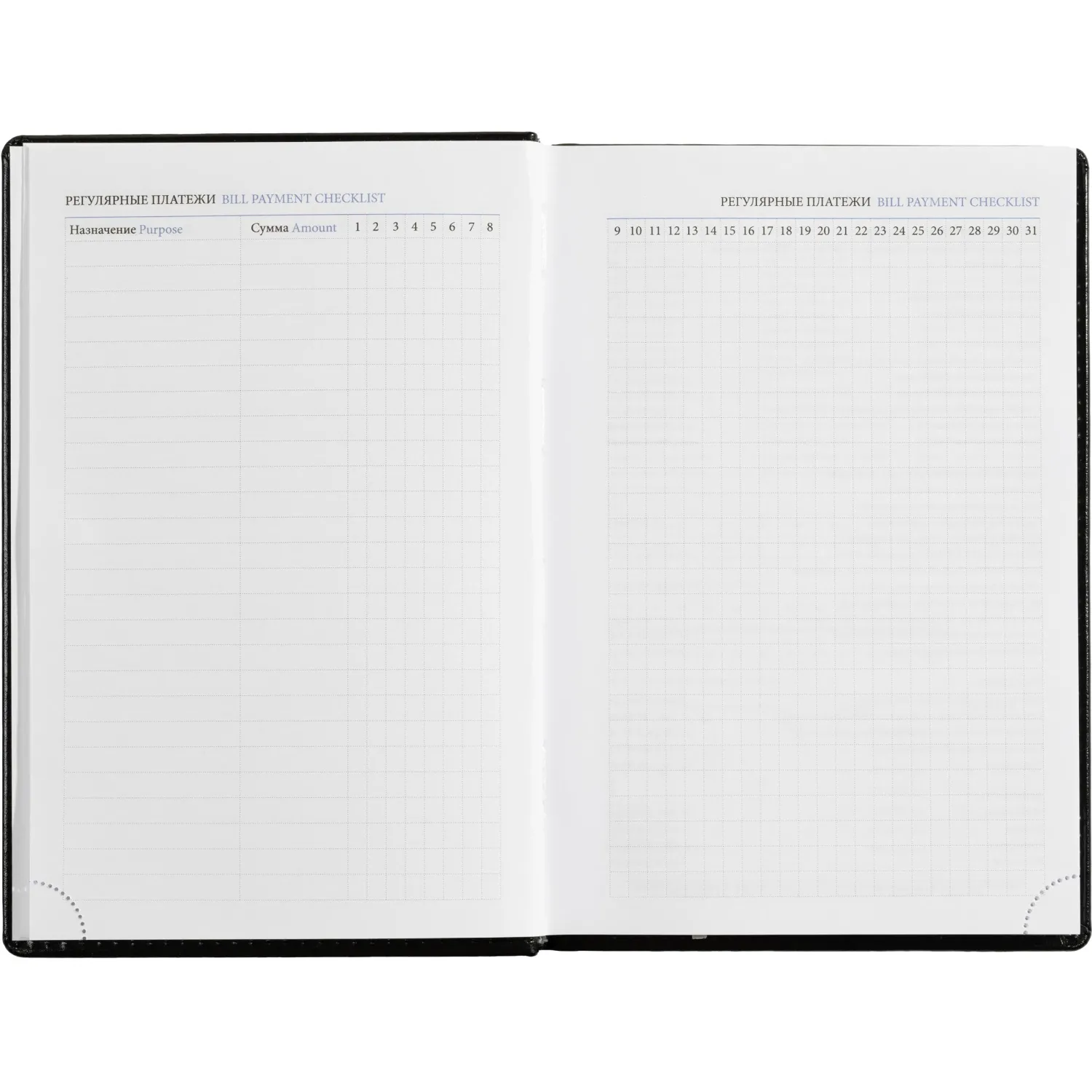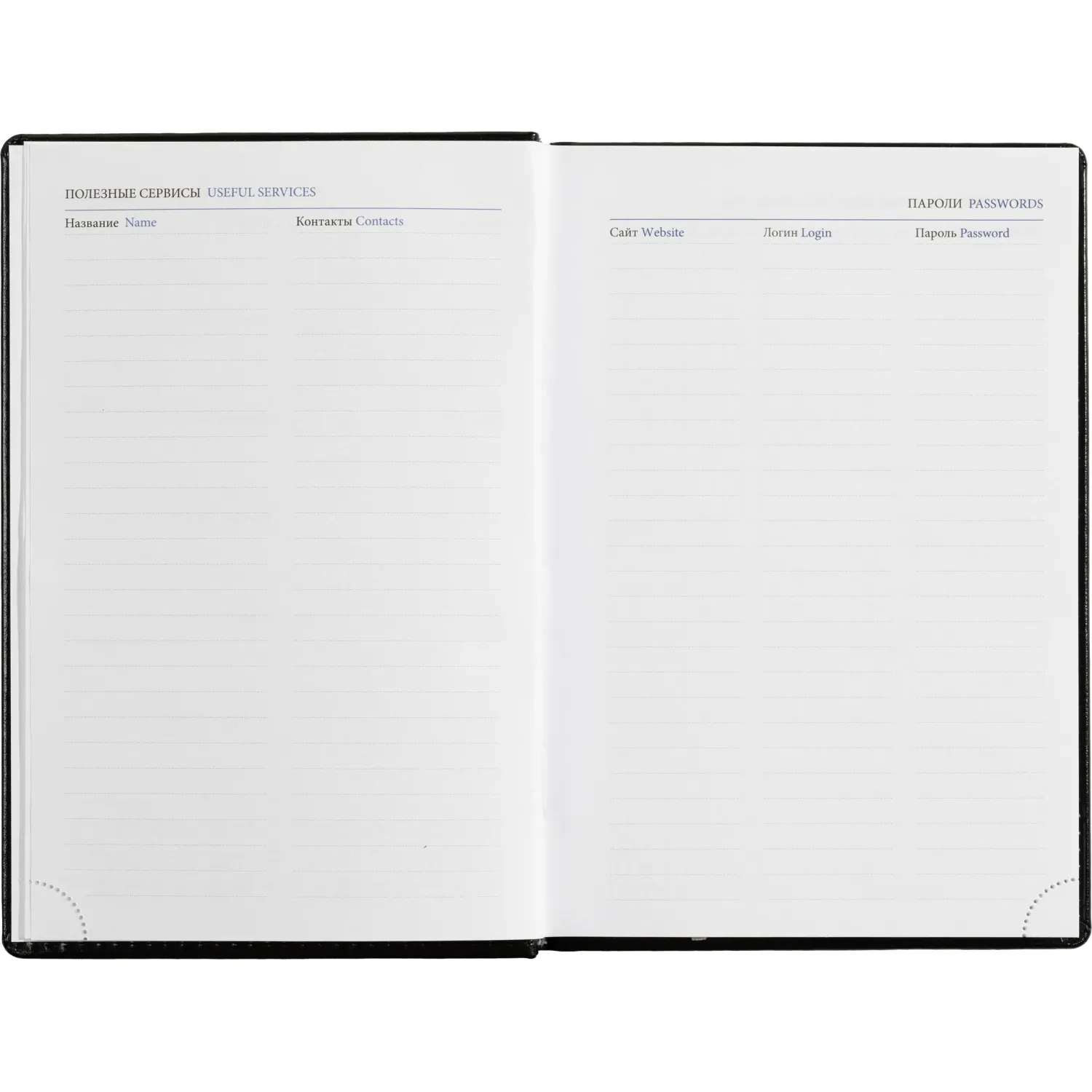 Внутренний блок состоит из 176 листов (352 страниц) белой офсетной бумаги плотностью 70-90 г/кв.м. Печать выполнена в 2 краски. Линовка — линейка. Предусмотрена перфорация уголка и серебристое ляссе. В конце блока находится алфавитный раздел без вырубки.