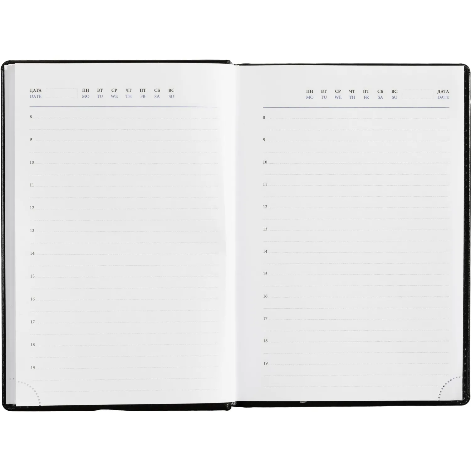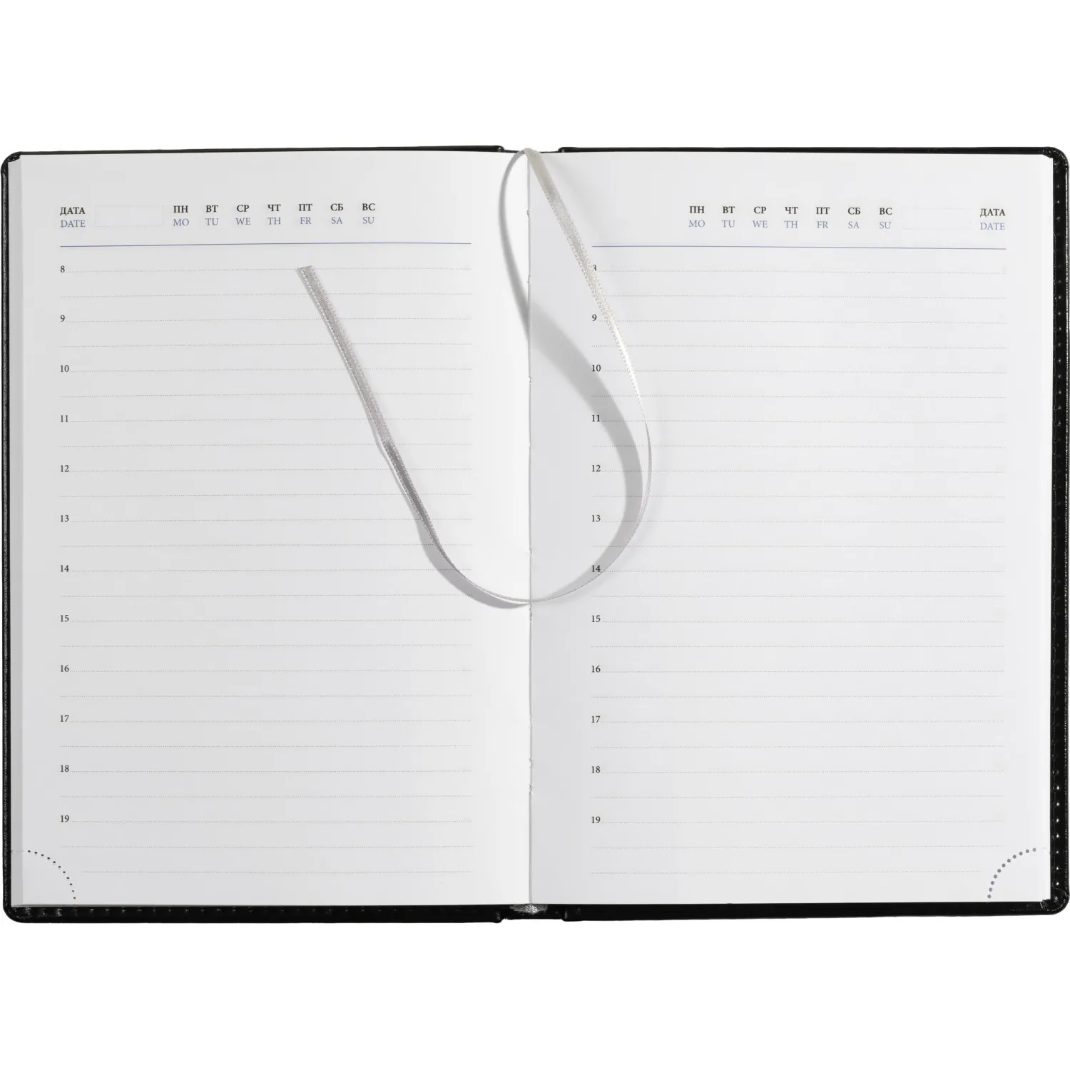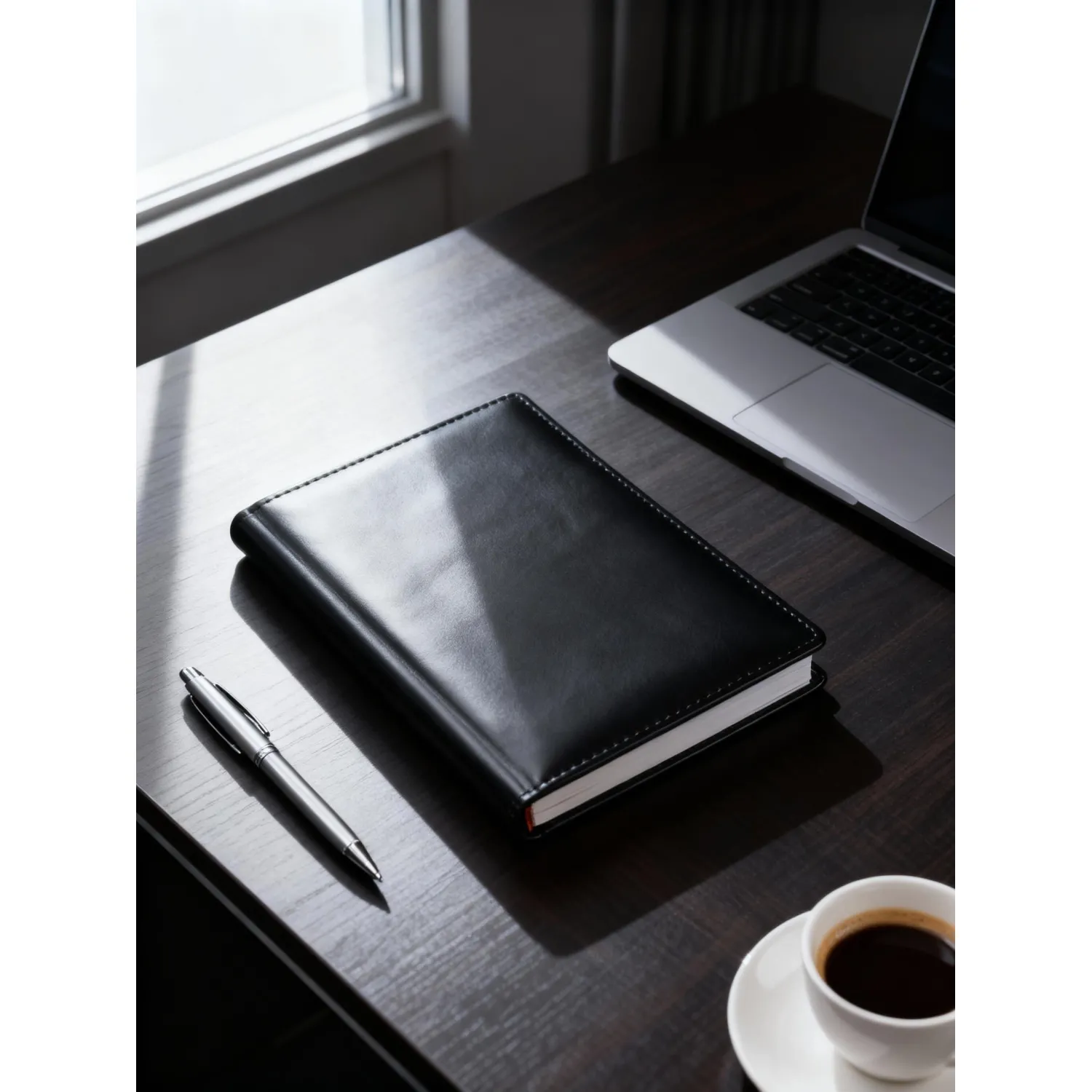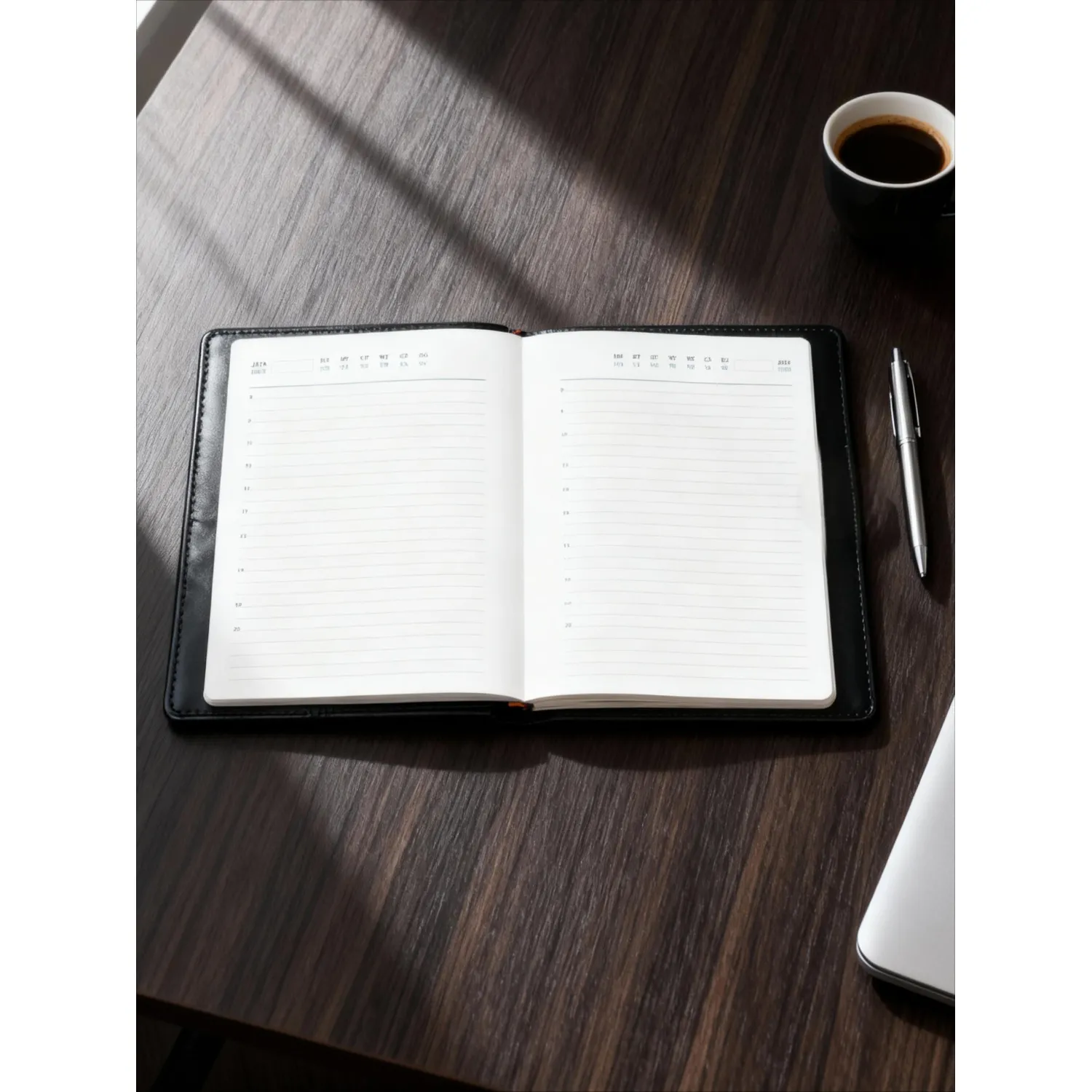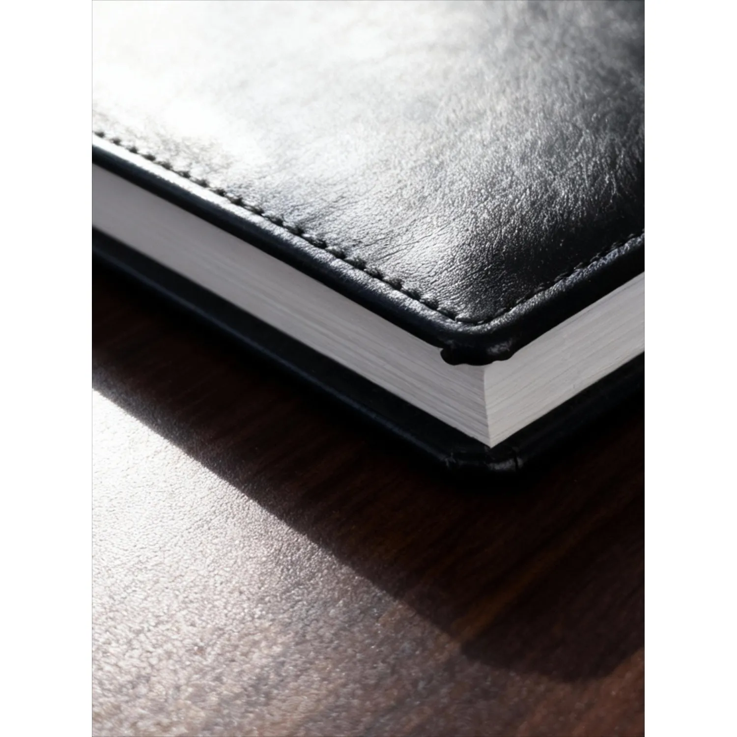 Ежедневник недатированный Attache Agenda — ежедневник размером 148×218 мм с однотонной чёрной обложкой из высококачественного переплётного материала, имитирующего натуральную кожу. Обложка твёрдая, с поролоном и гладкой фактурой с лёгким блеском, по периметру украшена отделочной строчкой в цвет материала. Возможна персонализация — нанесение логотипа любым способом тиснения.