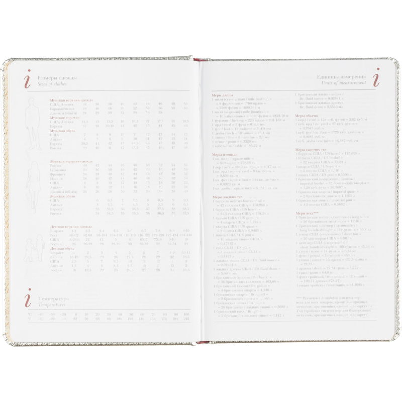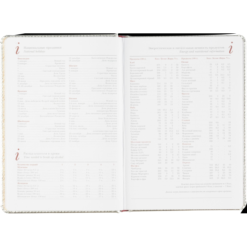 Внутренний блок состоит из 136 страниц белой офсетной бумаги плотностью 70 г/кв.м. и включает несколько разделов: планирование с линовкой и указанием времени с интервалом в один час, 14 страниц справочной информации (включая часовые пояса, аэропорты, телефонные коды, штрихкоды, религиозные праздники и другие полезные данные), а также 19 страниц для телефонной книги.