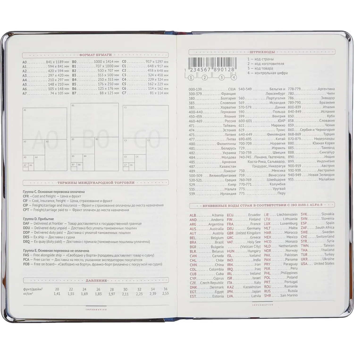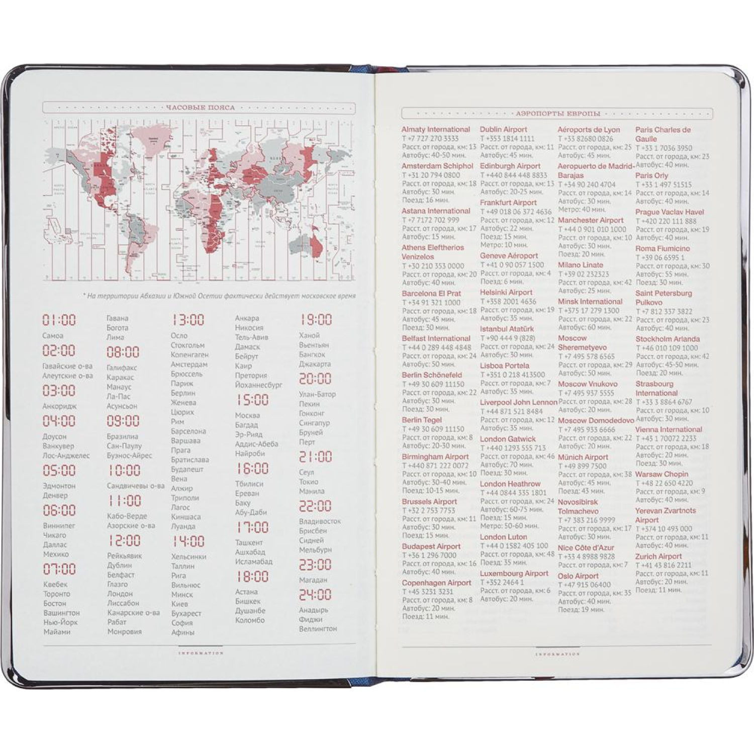 Ежедневник включает 17 страниц справочной информации с полезными данными, такими как часовые пояса, размеры одежды, телефонные коды и другие сведения.