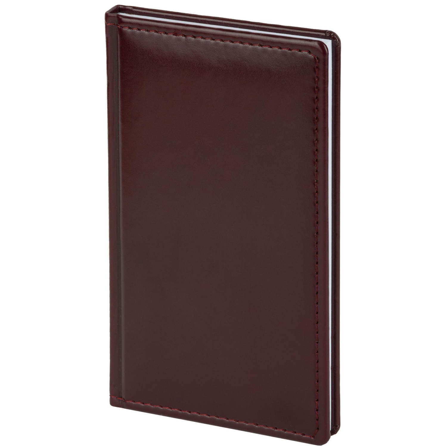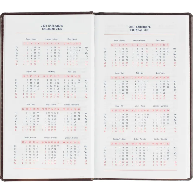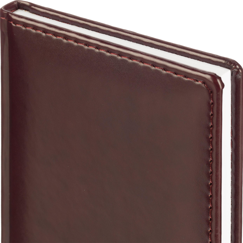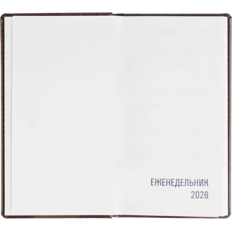 Еженедельник датированный на 2026 год. Формат: 90×160 мм. Цвет: бордовый. Блок 128 полос (64 листа) в 2 краски. Бумага офсетная 70 г/кв.м. Блок с перфорацией уголка. Дополнительный блок со справочной информацией. Календарь на 2026-2027 года. Твердая обложка с прошивкой по периметру выполнена из искусственной кожи высокого качества. Возможно нанесение логотипа на обложку, любым способом тиснения (блинт или фольга).