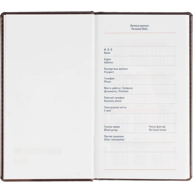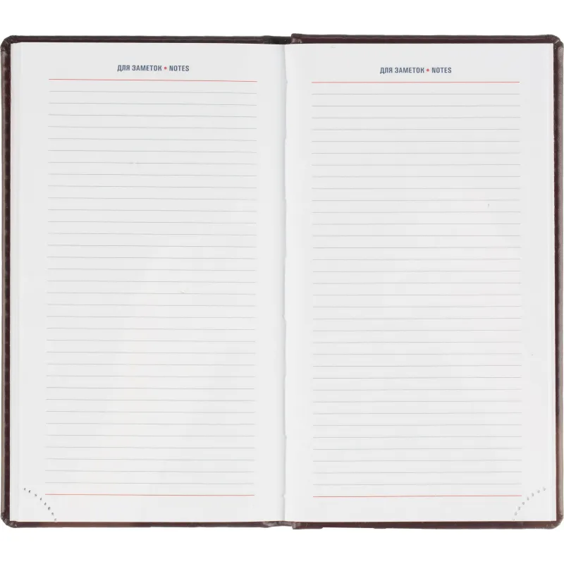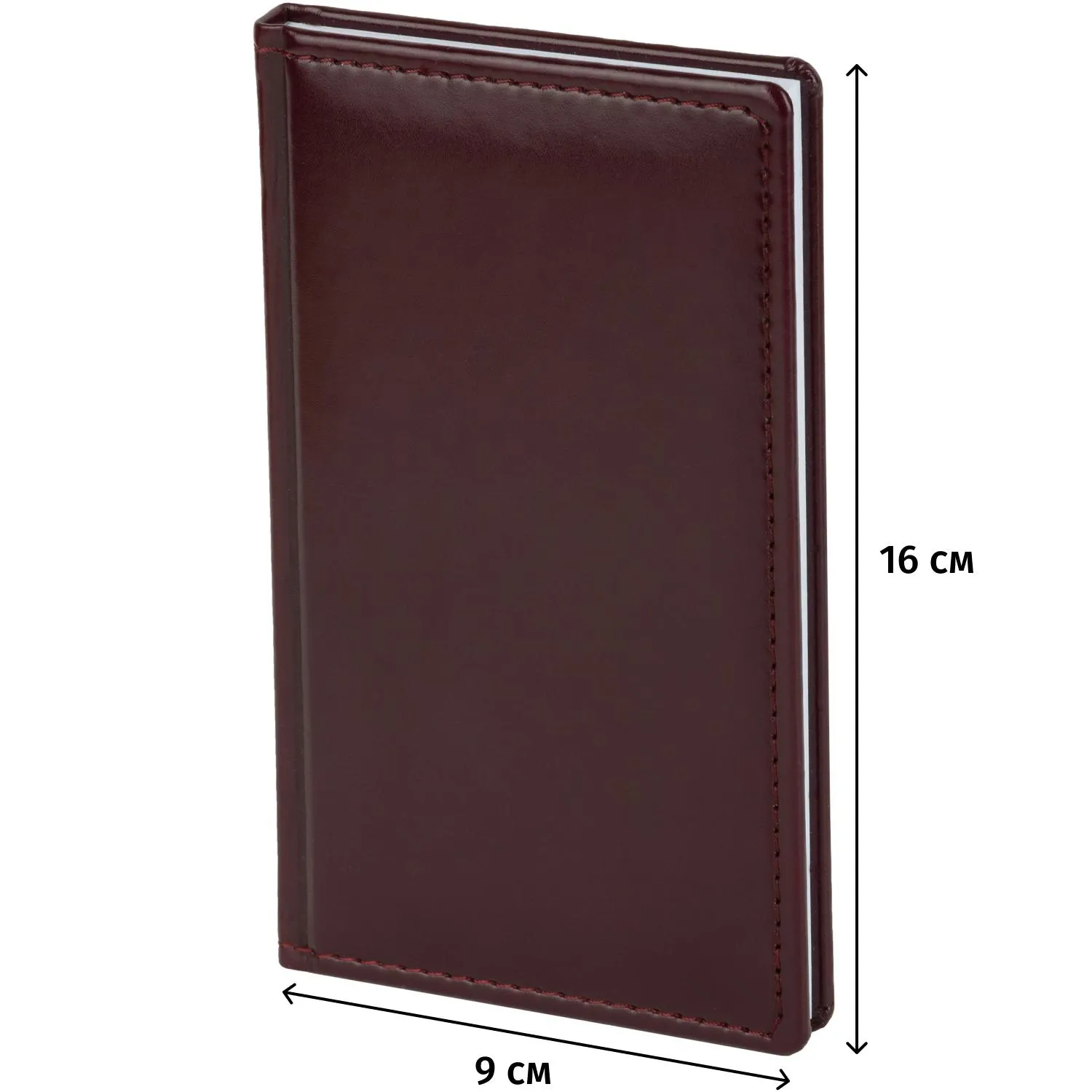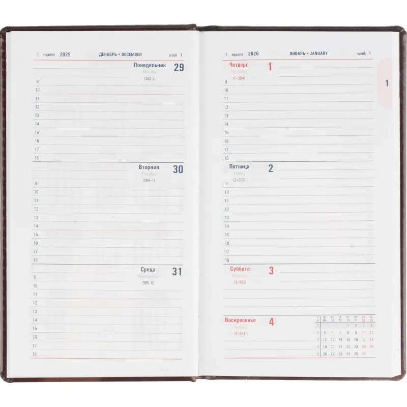Еженедельник датированный на 2026 год. Формат: 90×160 мм. Цвет: бордовый. Блок 128 полос (64 листа) в 2 краски. Бумага офсетная 70 г/кв.м. Блок с перфорацией уголка. Дополнительный блок со справочной информацией. Календарь на 2026-2027 года. Твердая обложка с прошивкой по периметру выполнена из искусственной кожи высокого качества. Возможно нанесение логотипа на обложку, любым способом тиснения (блинт или фольга).
