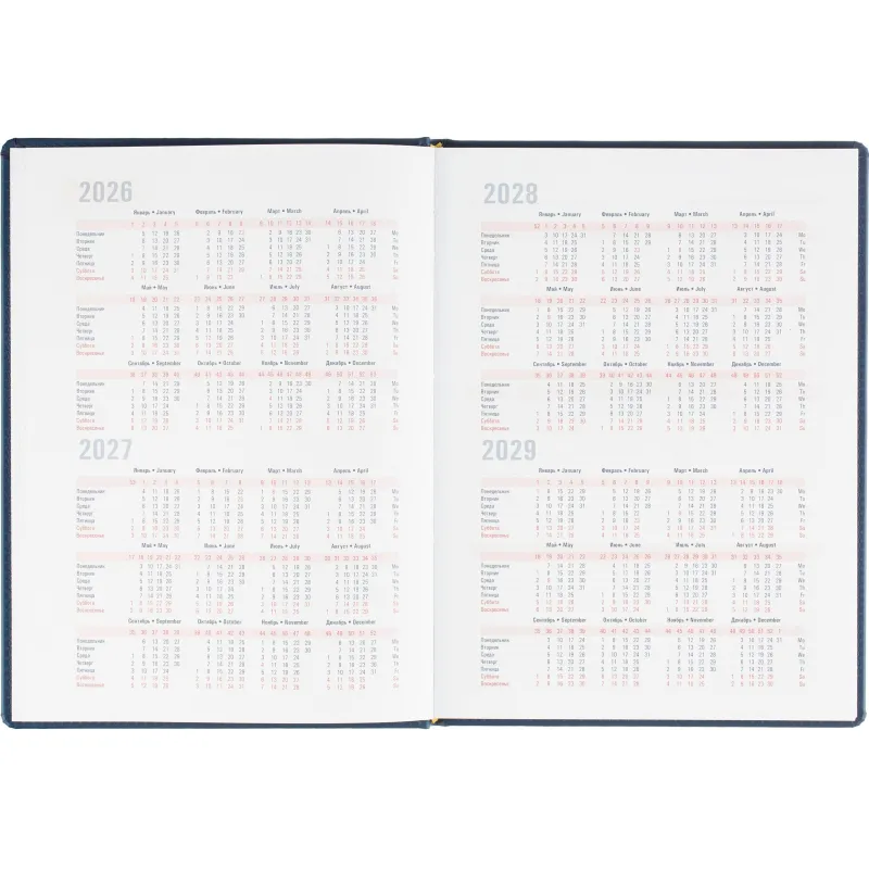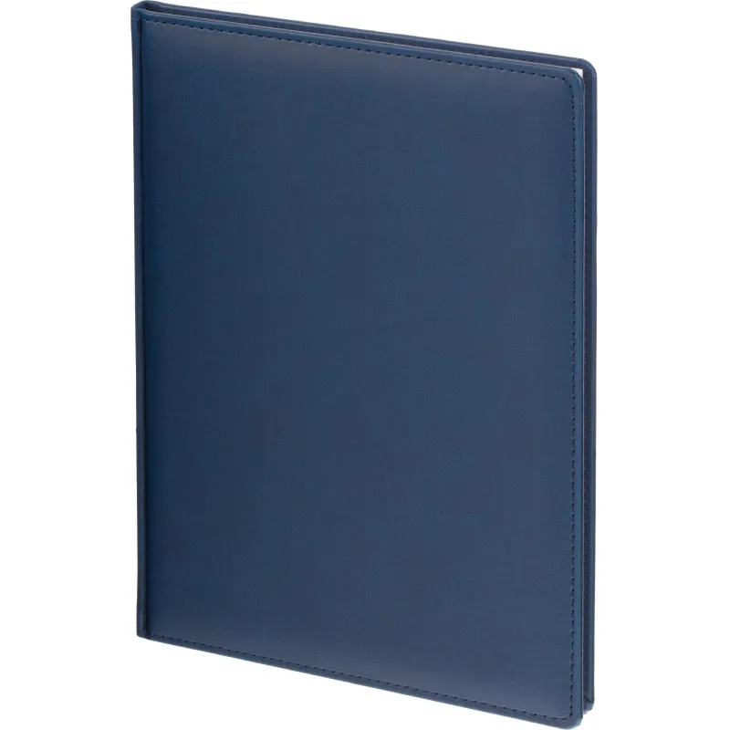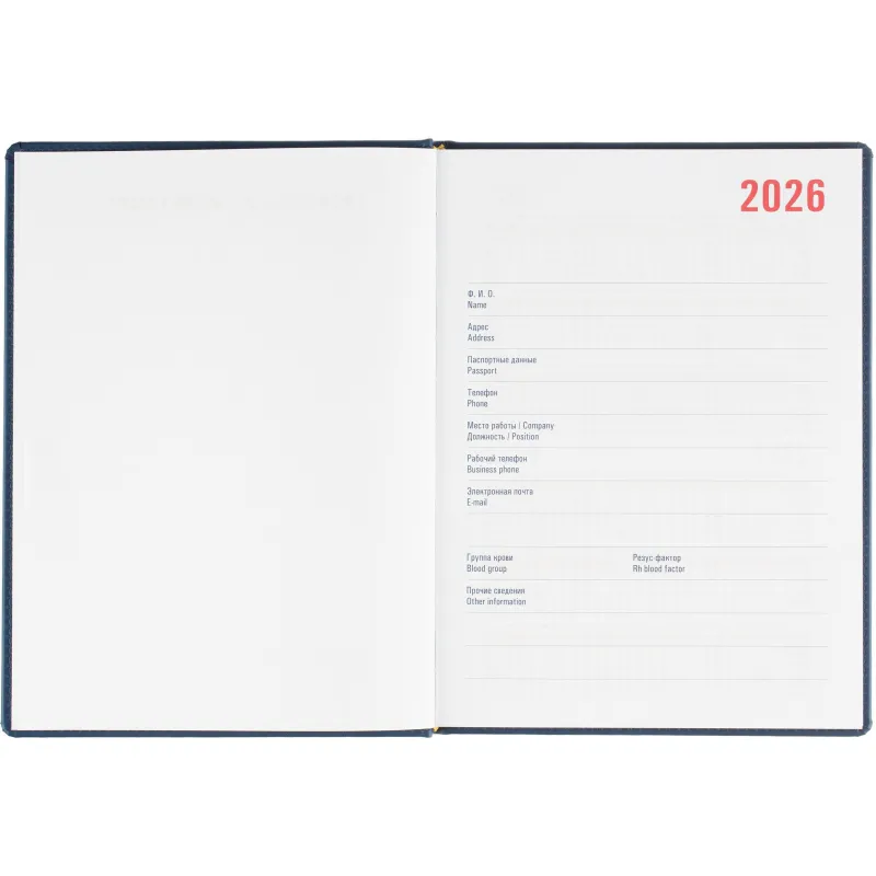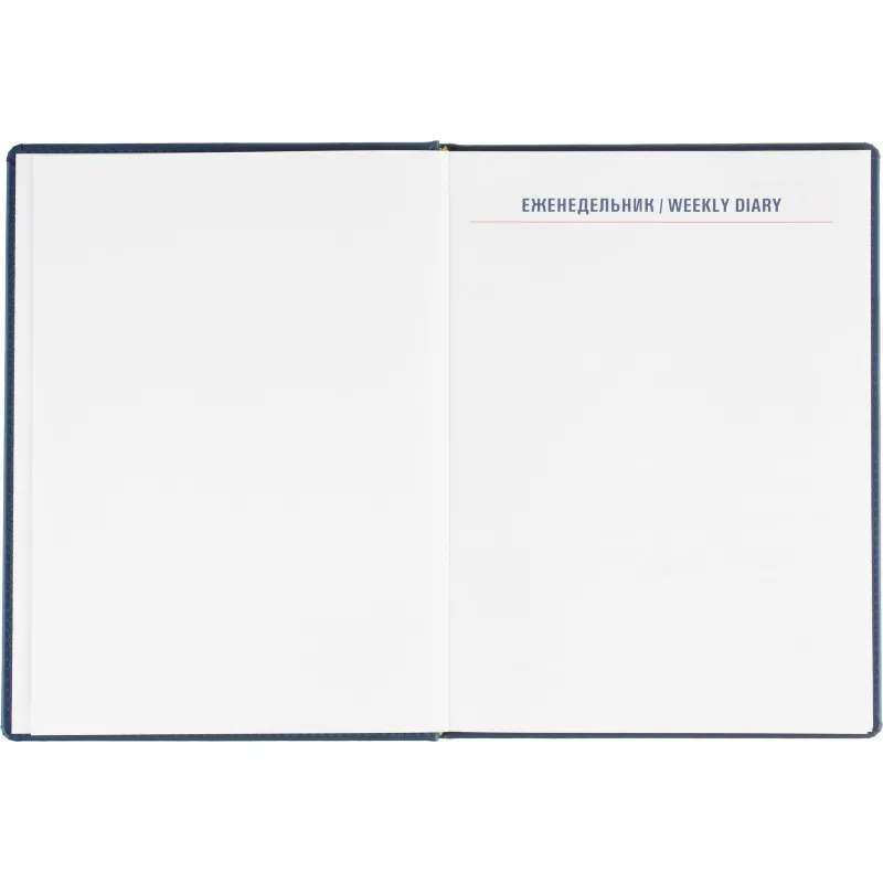 Еженедельник датированный на 2026 год. Формат: 200×270 мм. Цвет: синий. Блок 144 страницы (72 листа) в 2 краски. Бумага офсетная 70 г/кв.м. Блок с перфорацией уголка. Алфавитный блок без вырубки. Дополнительный блок со справочной информацией включает: календарь на 2026-2029 года, планирование на год, справочная информация, карта часовых поясов, лучшие места отдыха в зависимости от времени года, международные размеры одежды и обуви, символы по уходу за одеждой, знаки зодиака, питание и расход калорий. Закладка-ляссе.Твердая обложка с прошивкой по периметру выполнена из искусственной кожи высокого качества. Возможно нанесение логотипа на обложку, любым способом тиснения (блинт или фольга).