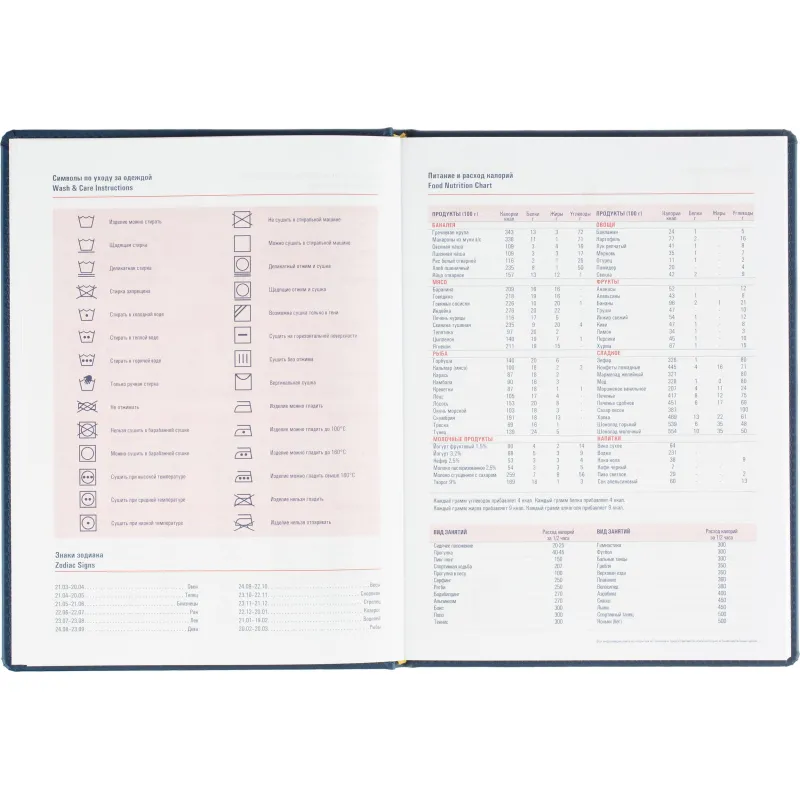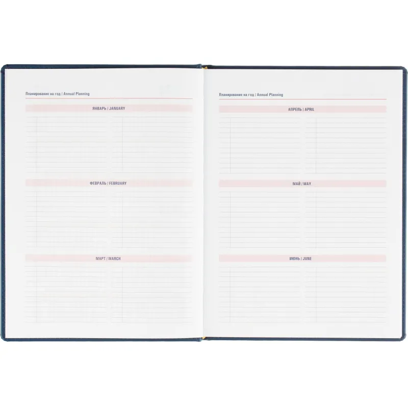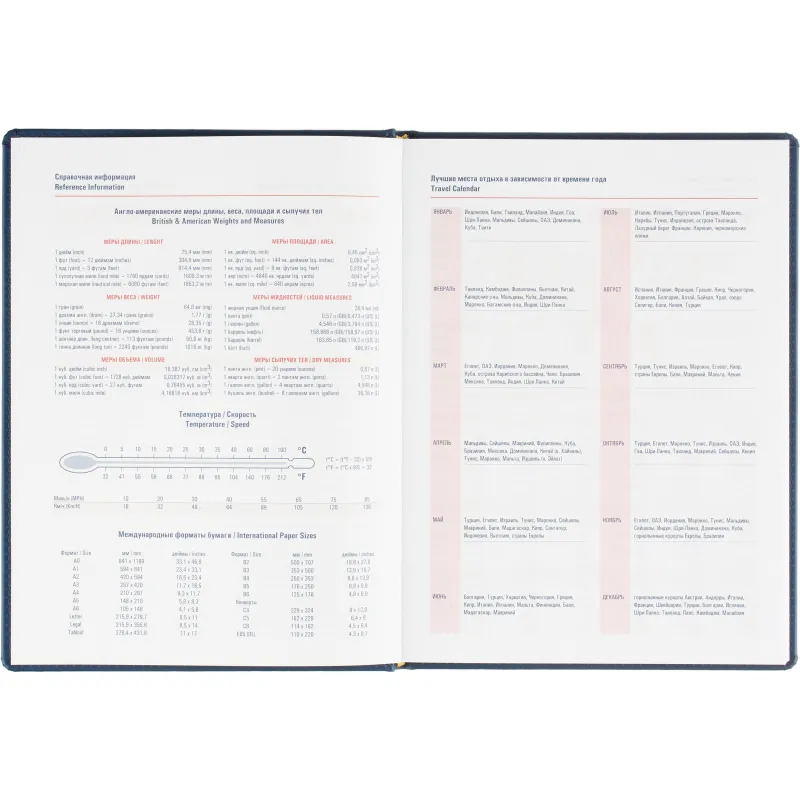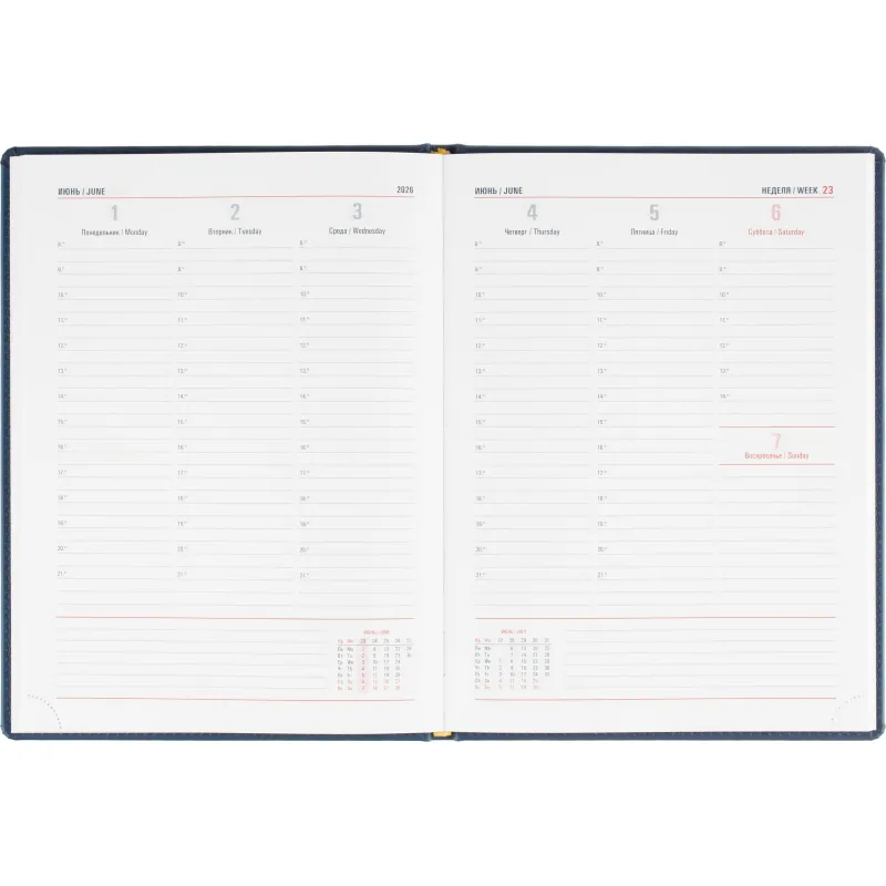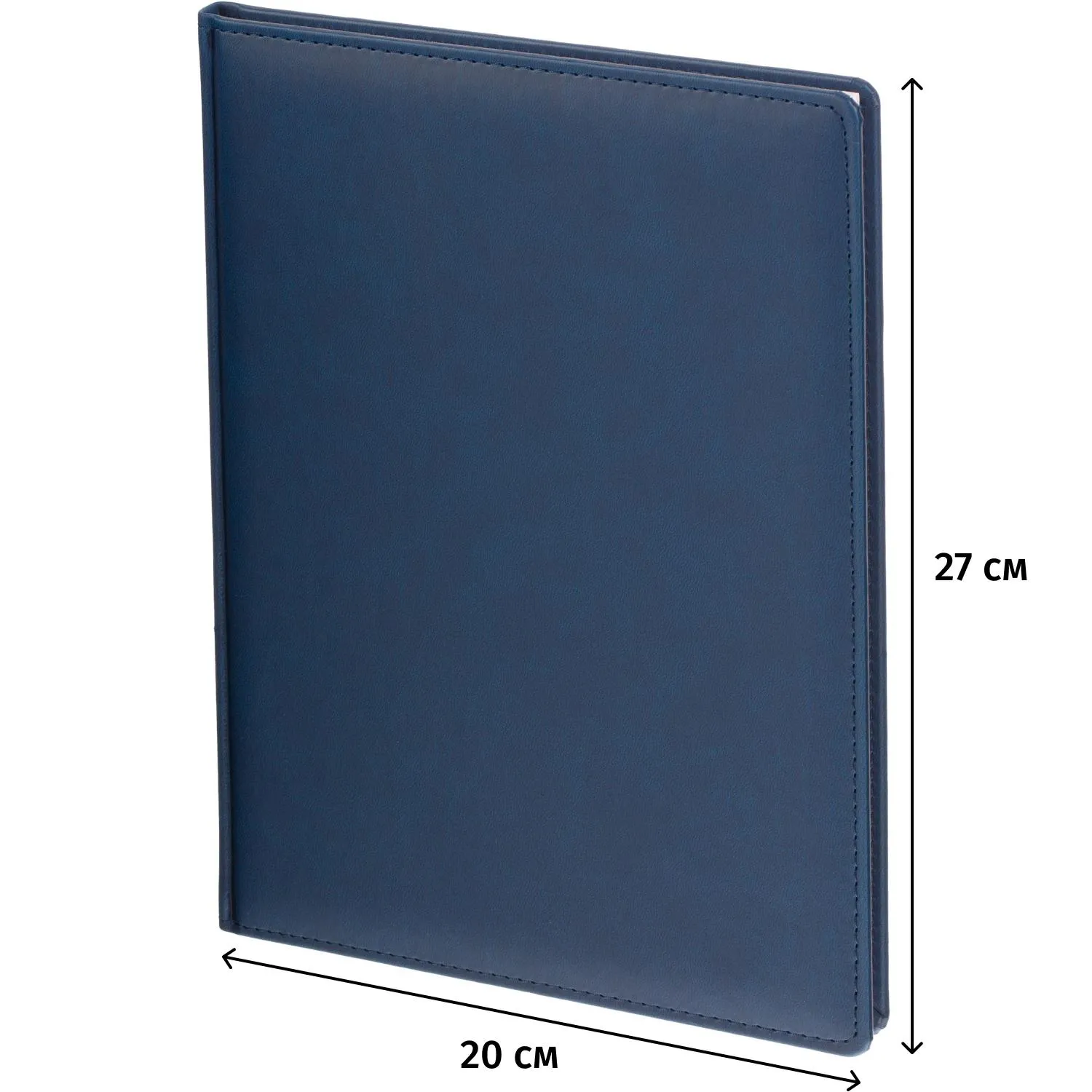 Еженедельник датированный на 2026 год. Формат: 200×270 мм. Цвет: синий. Блок 144 страницы (72 листа) в 2 краски. Бумага офсетная 70 г/кв.м. Блок с перфорацией уголка. Алфавитный блок без вырубки. Дополнительный блок со справочной информацией включает: календарь на 2026-2029 года, планирование на год, справочная информация, карта часовых поясов, лучшие места отдыха в зависимости от времени года, международные размеры одежды и обуви, символы по уходу за одеждой, знаки зодиака, питание и расход калорий. Закладка-ляссе.Твердая обложка с прошивкой по периметру выполнена из искусственной кожи высокого качества. Возможно нанесение логотипа на обложку, любым способом тиснения (блинт или фольга).