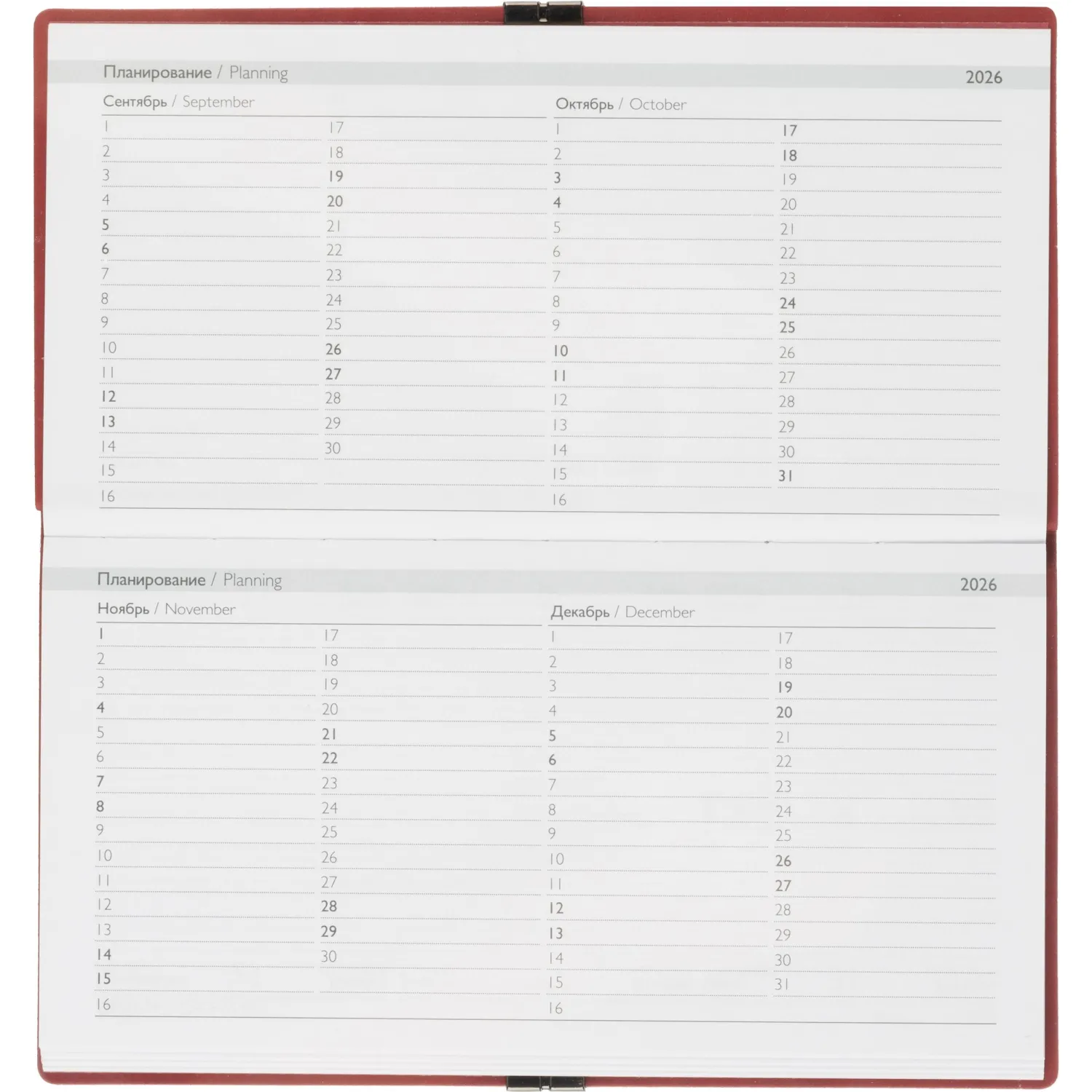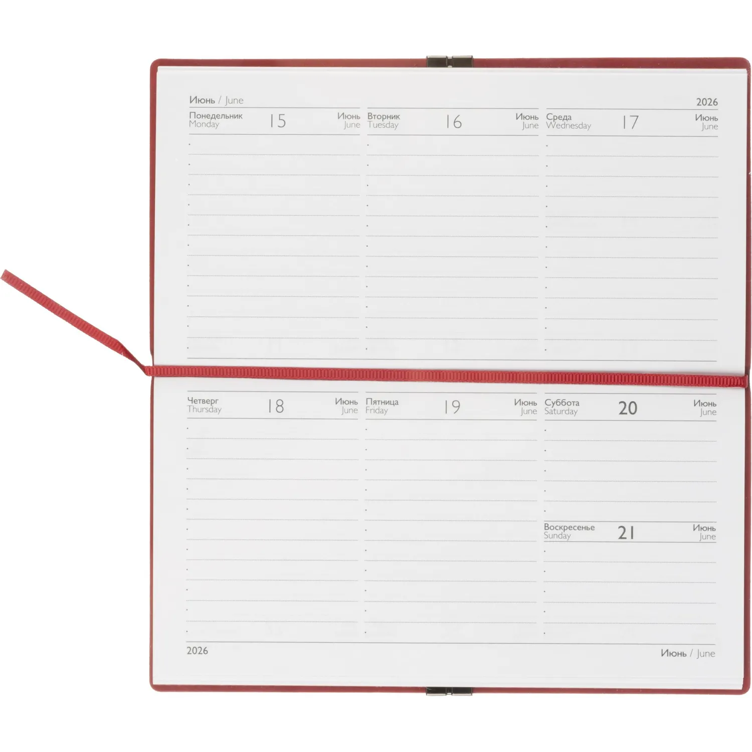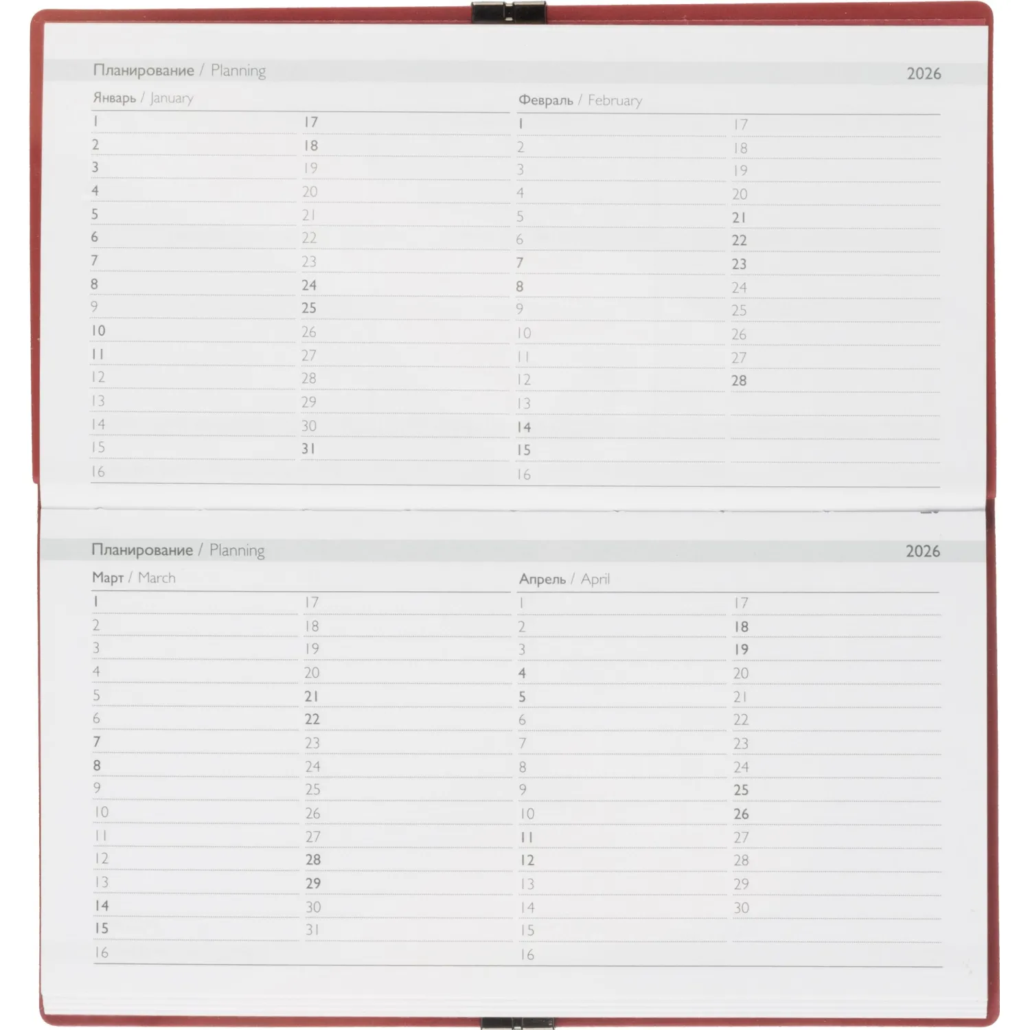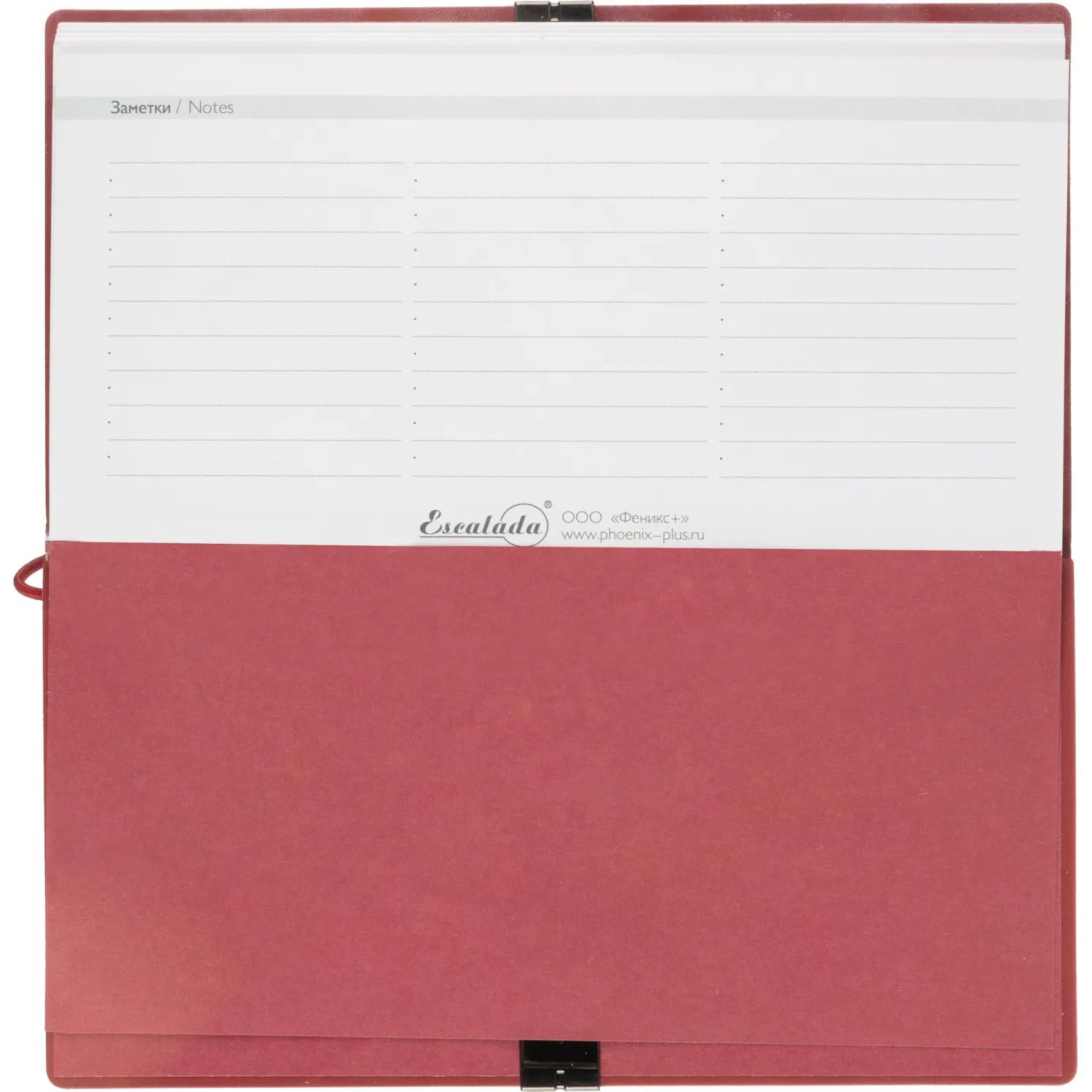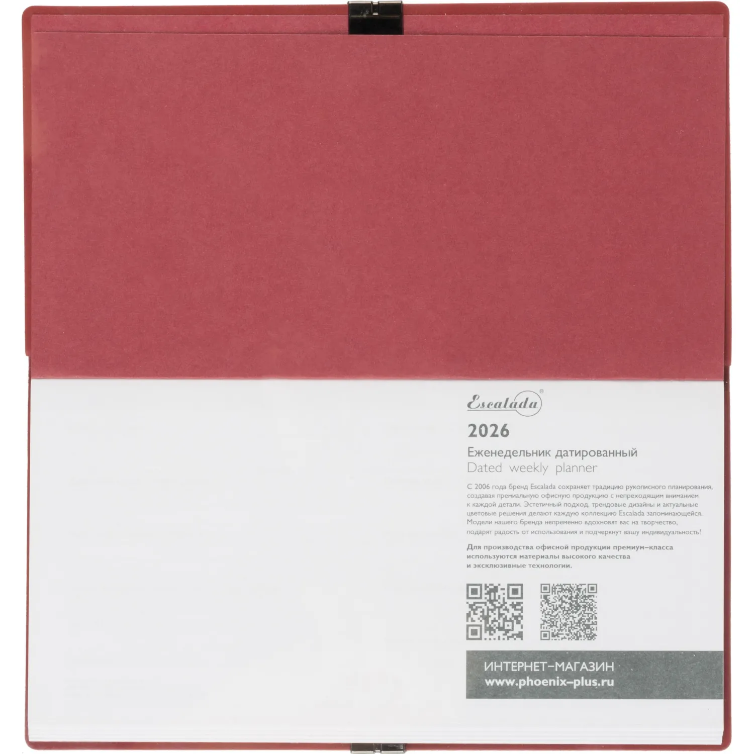 Еженедельник датированный Escalada, на 2026 год, искусственная кожа, размер 175×95 мм, 64 листа, красный с фиксирующей резинкой. Обложка: мягкий переплёт, блинтовое тиснение, обстрочка по периметру — нет, скруглённый корешок, прямые углы обложки.
