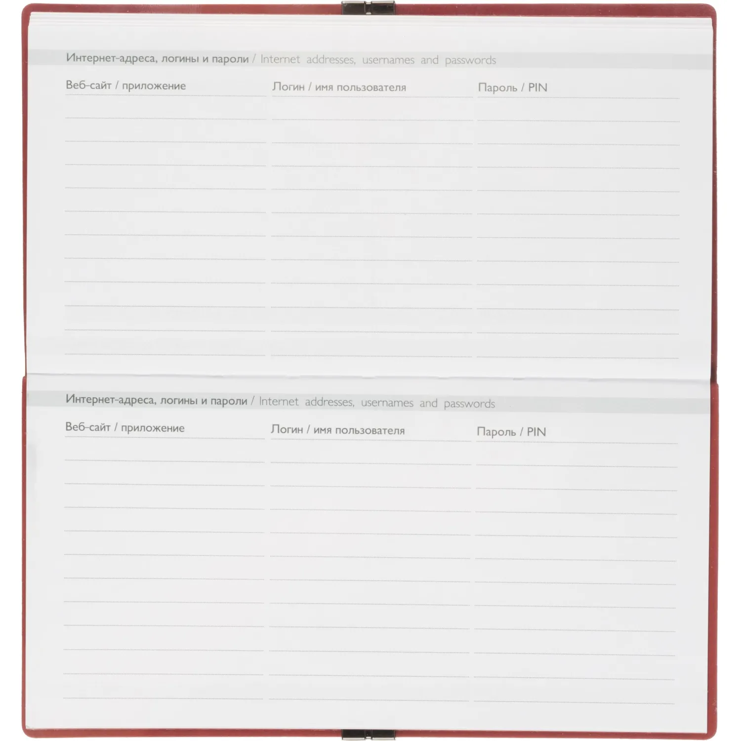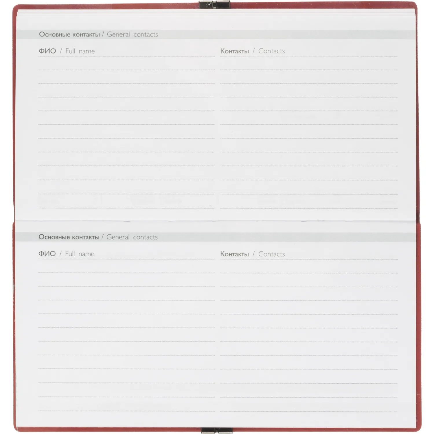 Внутренний блок: ниткошвейный, белый офсет 70 г/кв.м, печать в одну краску (линия), прямые углы блока, перфорация углов блока — нет, справочный материал — есть. Красочность форзаца: печать пантоном. Закладка: одно ляссе. Каптал: нет. Особенности: застёжка-резинка. Индивидуальная упаковка: ПЭТ-пакет.