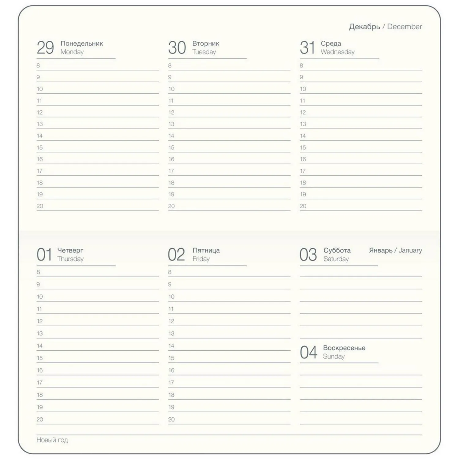 Датированный внутренний блок в линейку на 64 листа (128 страниц) — из высококачественной бумаги цвета слоновой кости плотностью 70 г/м2. Информационный блок еженедельника включает в себя: календари на 2026-2027 гг, развороты с планированием и важными датами, развороты для заметок в начале и конце блока.