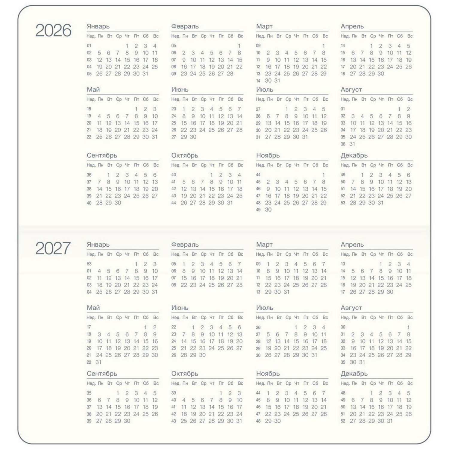 Датированный внутренний блок в линейку на 64 листа (128 страниц) — из высококачественной бумаги цвета слоновой кости плотностью 70 г/м2. Информационный блок еженедельника включает в себя: календари на 2026-2027 гг, развороты с планированием и важными датами, развороты для заметок в начале и конце блока.
