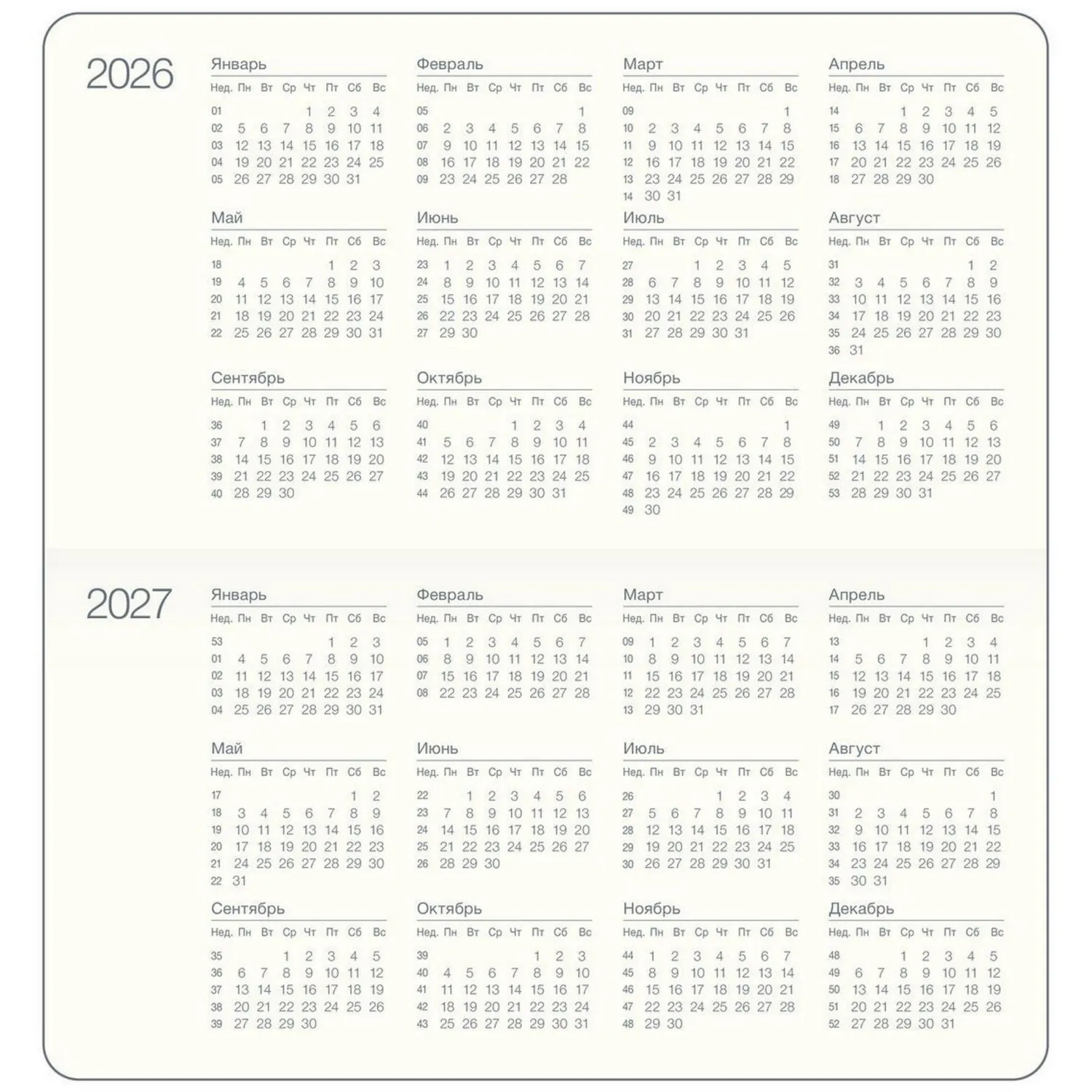 Датированный внутренний блок в линейку на 64 листа (128 страниц) — из высококачественной бумаги цвета слоновой кости плотностью 70 г/м2 и окрашенным обрезом. Информационный блок еженедельника включает в себя: календари на 2026-2027 гг, развороты с планированием и важными датами, развороты для заметок в начале и конце блока.