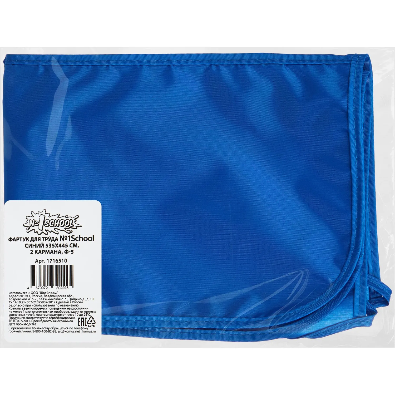 Фартук Комус Класс «Синий» для труда и занятий творчеством. Фартук с двумя карманами. Сделан из непромокаемой ткани полиэстра. Размер изделия — 535×445 мм. Цвет: синий. Страна производитель: Россия.