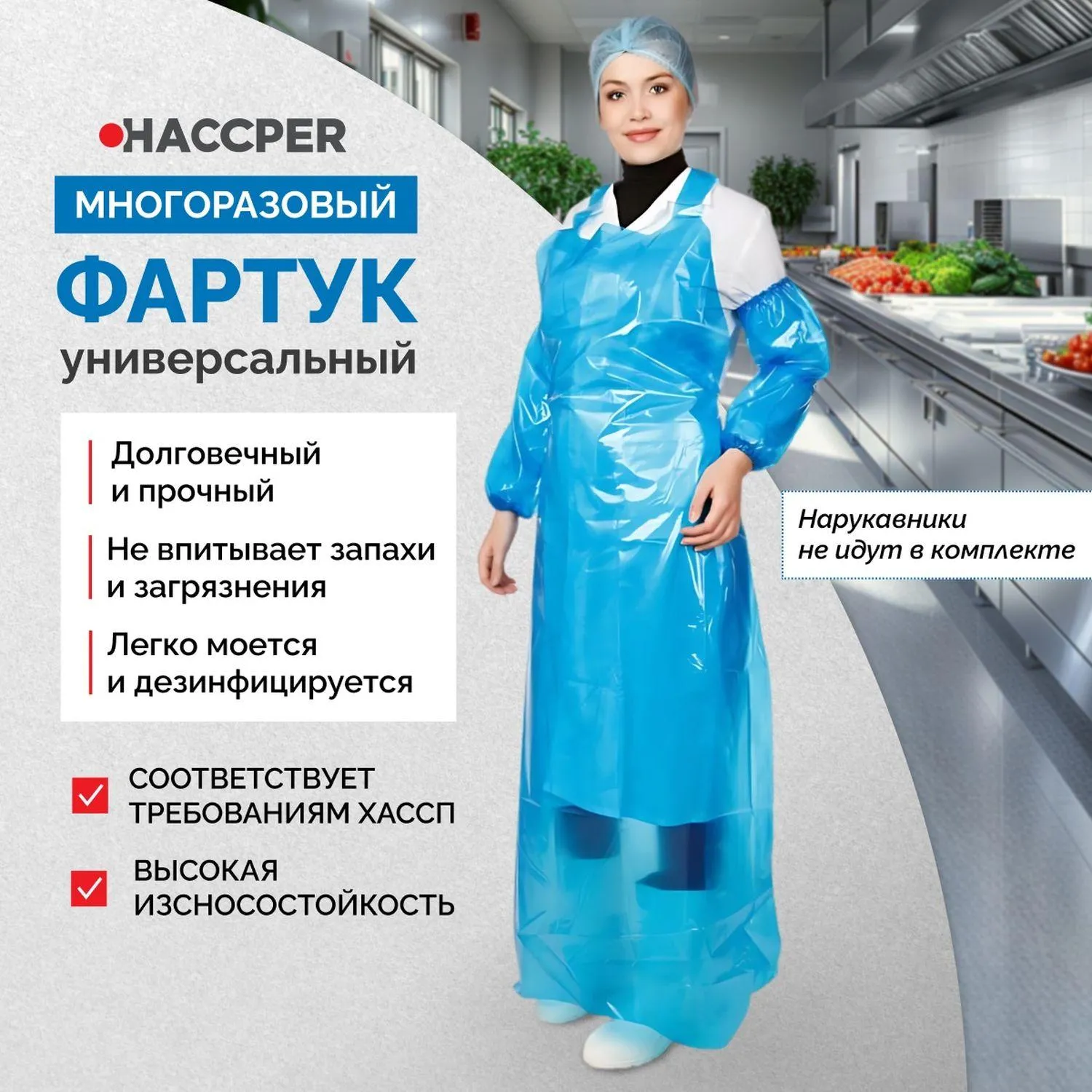 Фартук устойчив к жирам, моющим и дезинфицирующим растворам. Он сохраняет эластичность при температуре до −20°С, не вызывает аллергии, не имеет запаха и не выделяет вредных веществ. Лёгкий и гибкий, он не сковывает движения и удобен в работе.
