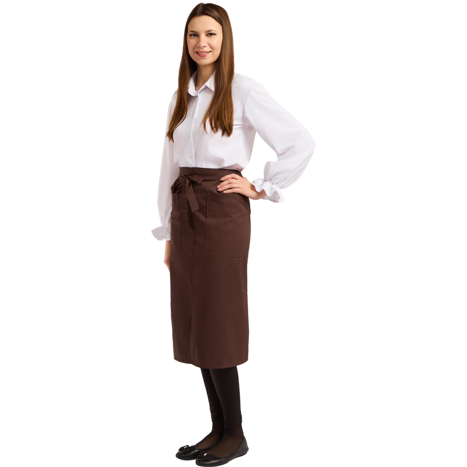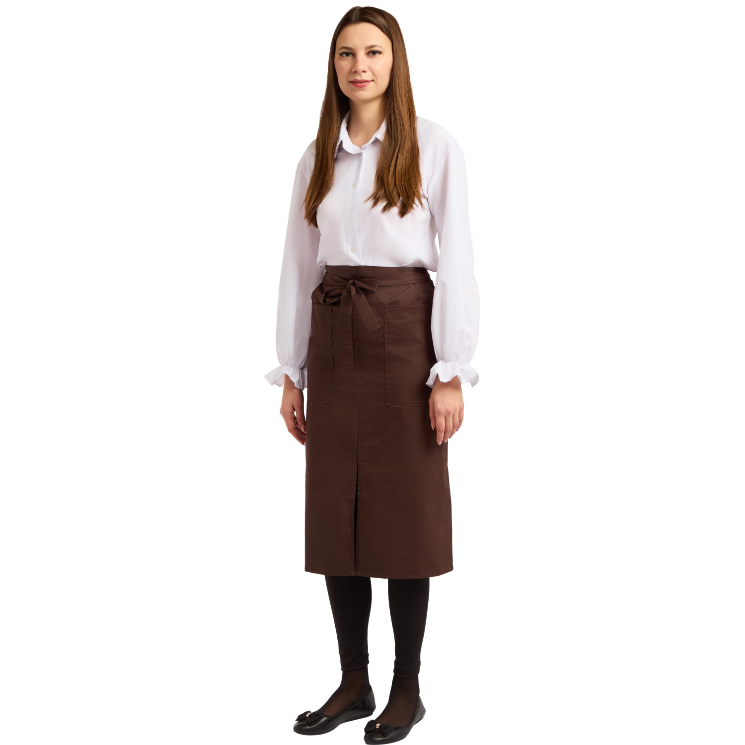 Фартук официанта универсальный средней длины коричневого цвета, завязывающийся по талии поясом, с разрезом cпереди для свободы движения и двумя накладными карманами. Изготовлен из смесовой ткани с водоотталкивающей пропиткой (65% полиэстер, 35% хлопок), плотностью 210 г/кв.м. Фартук из качественной и износостойкой ткани, подходит для работы в кафе, ресторанах, различных заведениях общепита.