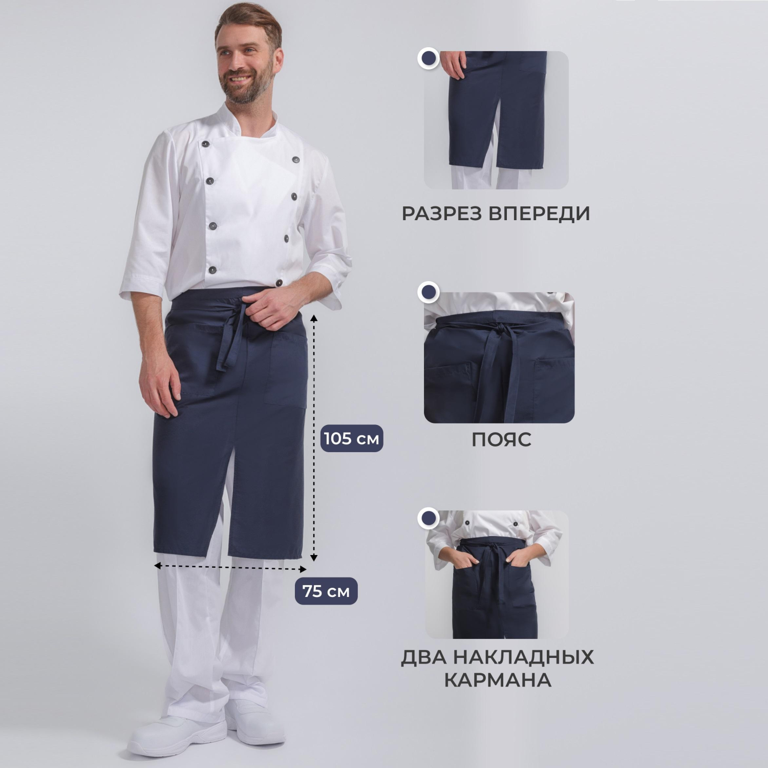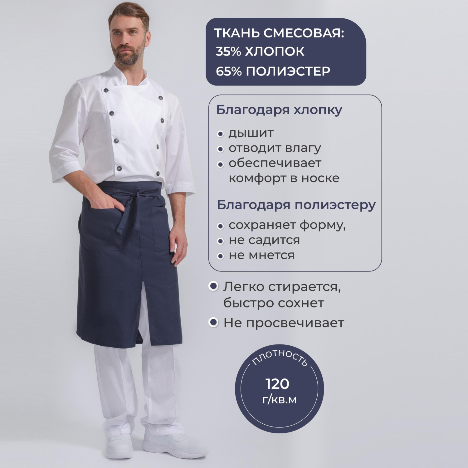 Фартук поварской шириной 105 см. и длинной 75 см, завязывающийся по талии поясом. С разрезом впереди, двумя накладными карманами. Плотность ткани —120 +/- 5 г/кв.м. Рекомендована стирка при температуре не выше 40 градусов.