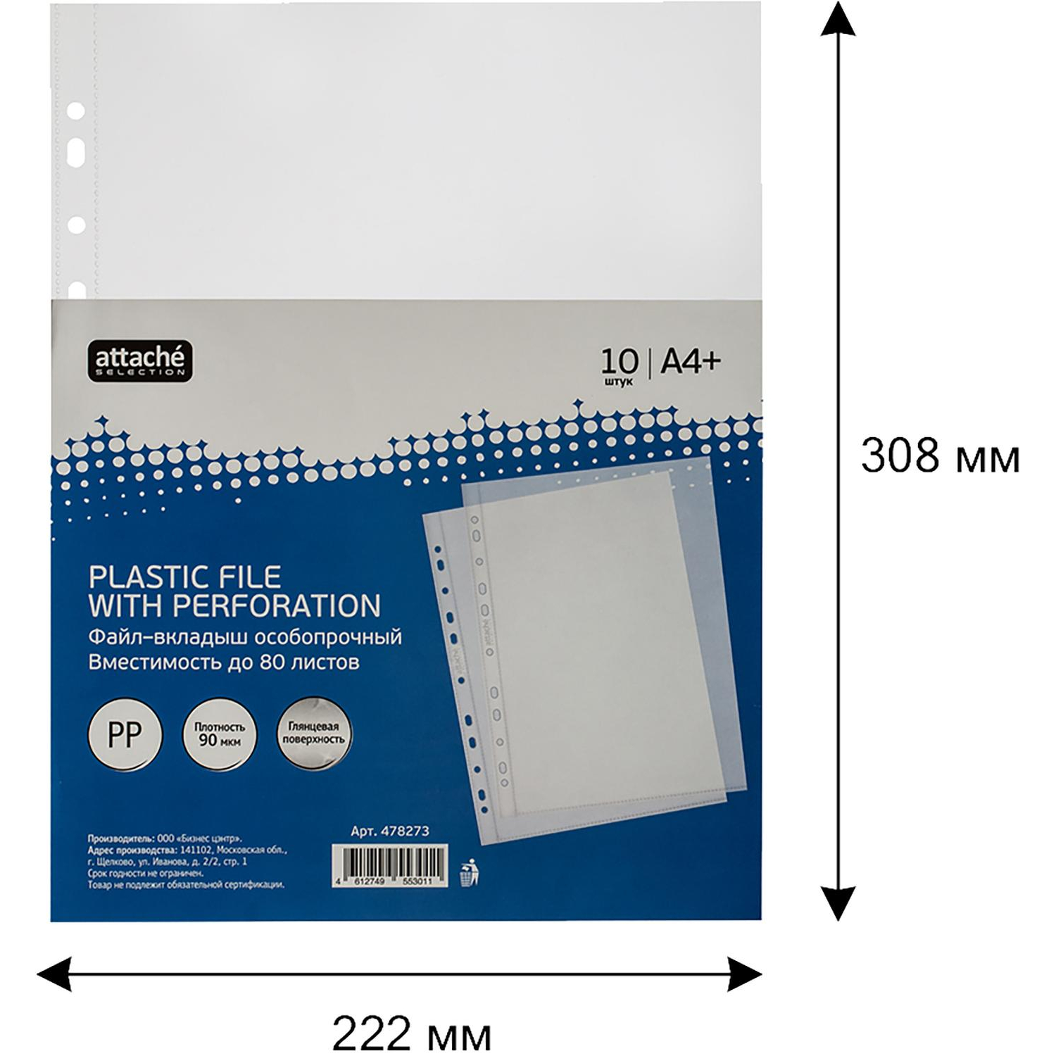 Файл-вкладыш Attache Selection предназначен для хранения и защиты документов. Формат А4. Изготовлен из полипропиленовой пленки (толщина 90 мкм). Внутренний размер 308×222 мм. Поверхность гладкая. Универсальная боковая перфорация подходит для разных типов скоросшивателей. В упаковке содержится 10 файлов. Каждый файл- вкладыш вмещает до 80 листов стандартной плотности. Стоимость указана за упаковку.