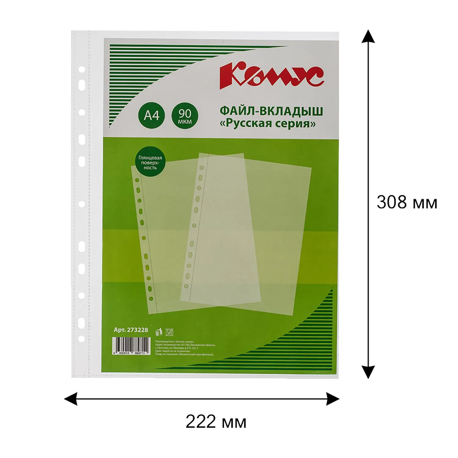 Файл-вкладыш Комус из коллекции Русская серия предназначен для хранения и защиты документов. Формат А4. Изготовлен из полипропиленовой пленки (толщина 90 мкм). Внутренний размер 308×222 мм. Поверхность гладкая. Универсальная боковая перфорация подходит для разных типов скоросшивателей. В упаковке содержится 10 файлов. Каждыйфайл-вкладыш вмещает до 80 листов стандартной плотности. Стоимость указана за упаковку.