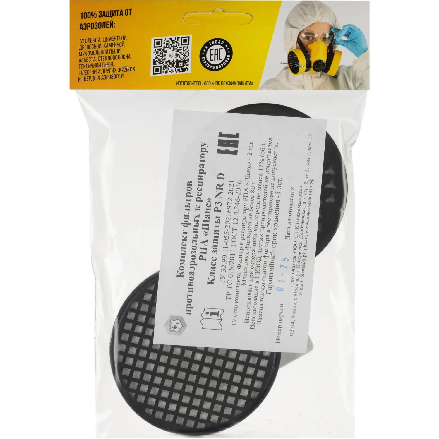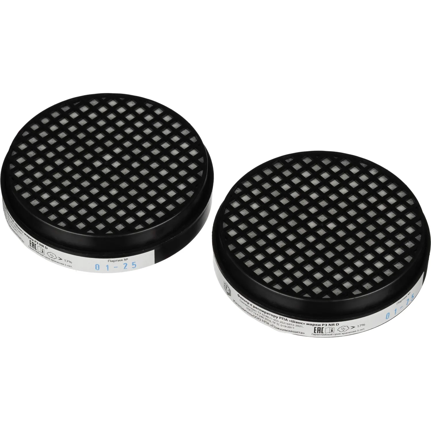 Комплект сменных фильтров P3 NR D к противоаэрозольному респиратору (РПА) «Шанс» для индивидуальной защиты органов дыхания при выполнении работ в атмосфере, загрязненной аэрозолями (пыль, дым, туман), при проведении противоэпидемических работ при загрязнении биологическими аэрозолями. Защищает от строительной, металлической, древесной, каменной, цементной пыли, мела, графита, стекловолокна, сварочного дыма, вирусов, бактерий и аэрозолей, радиоактивной пыли.