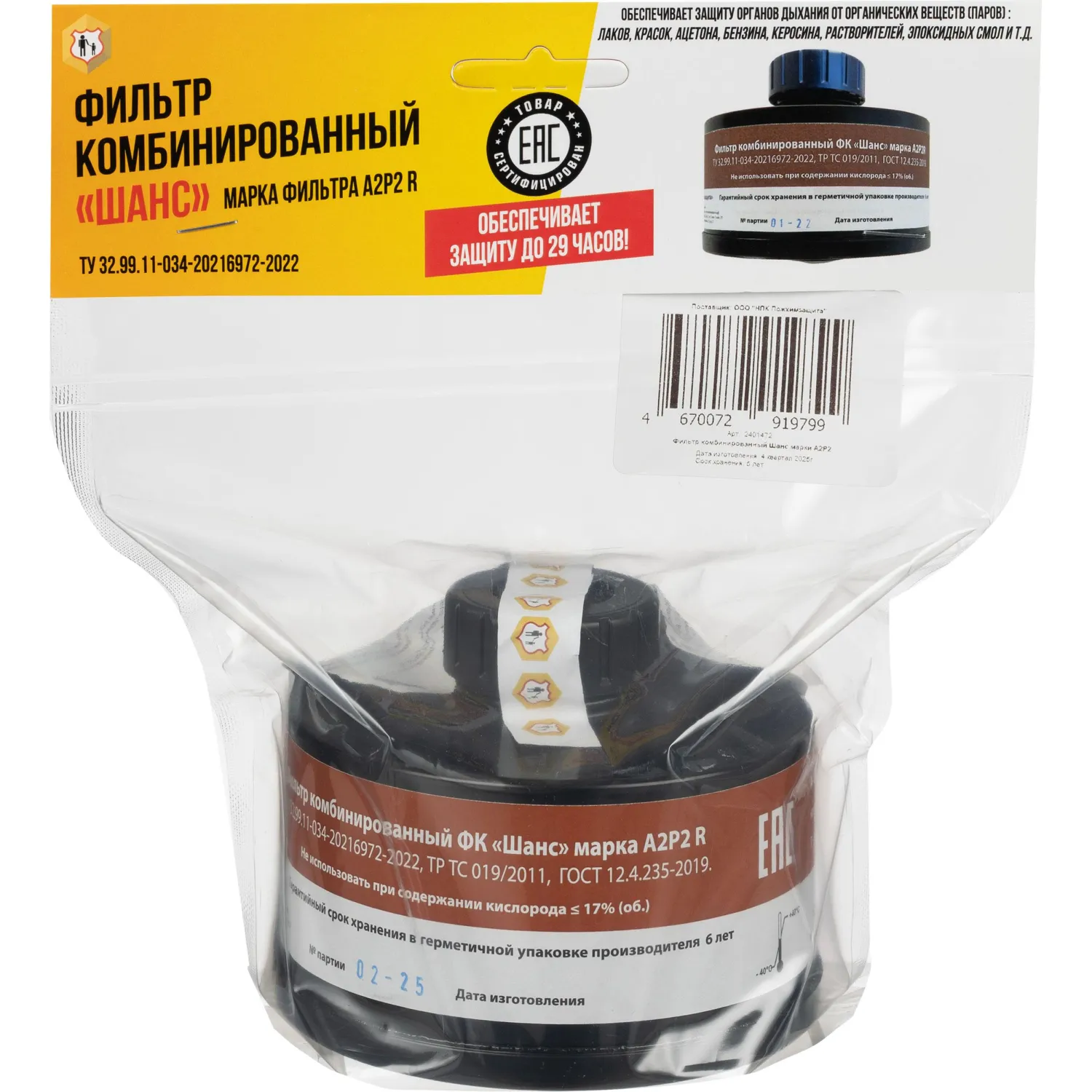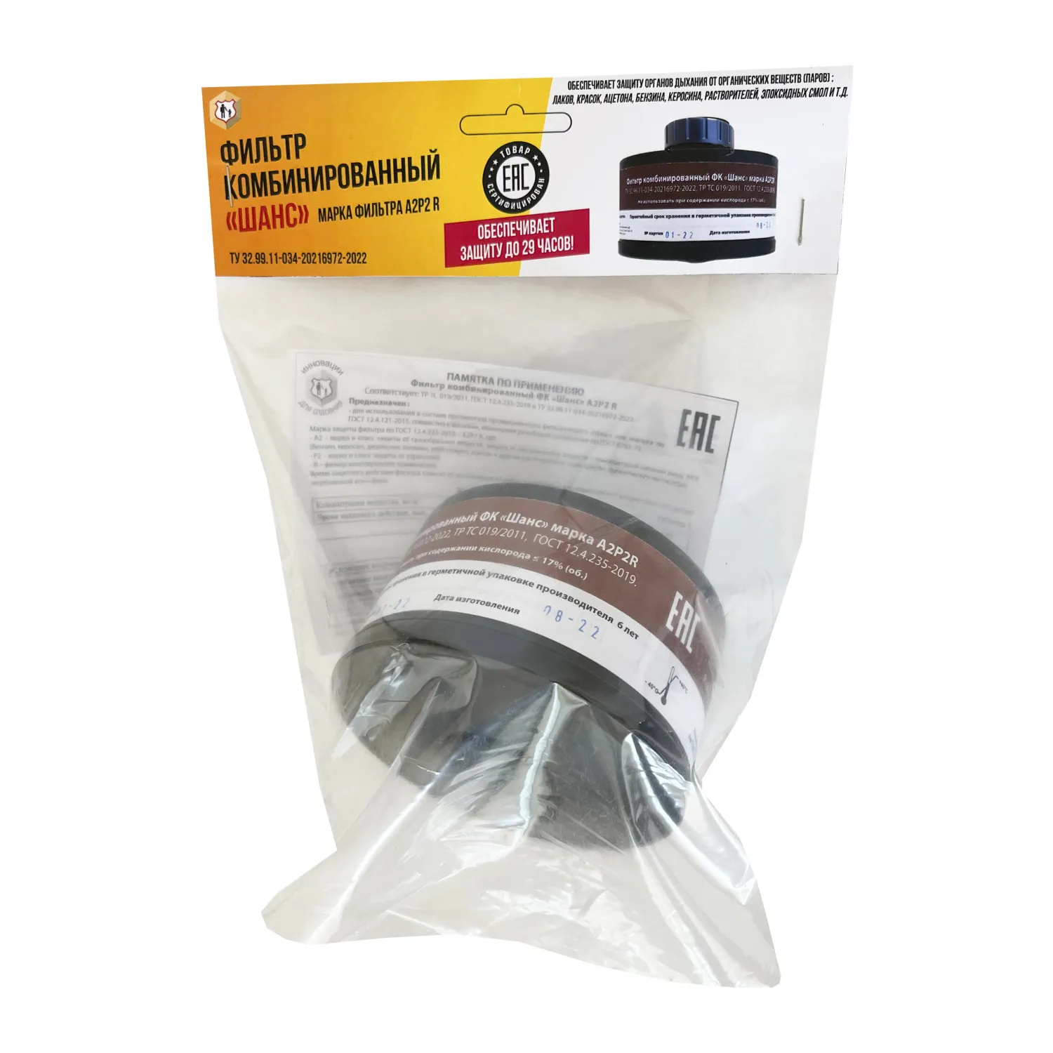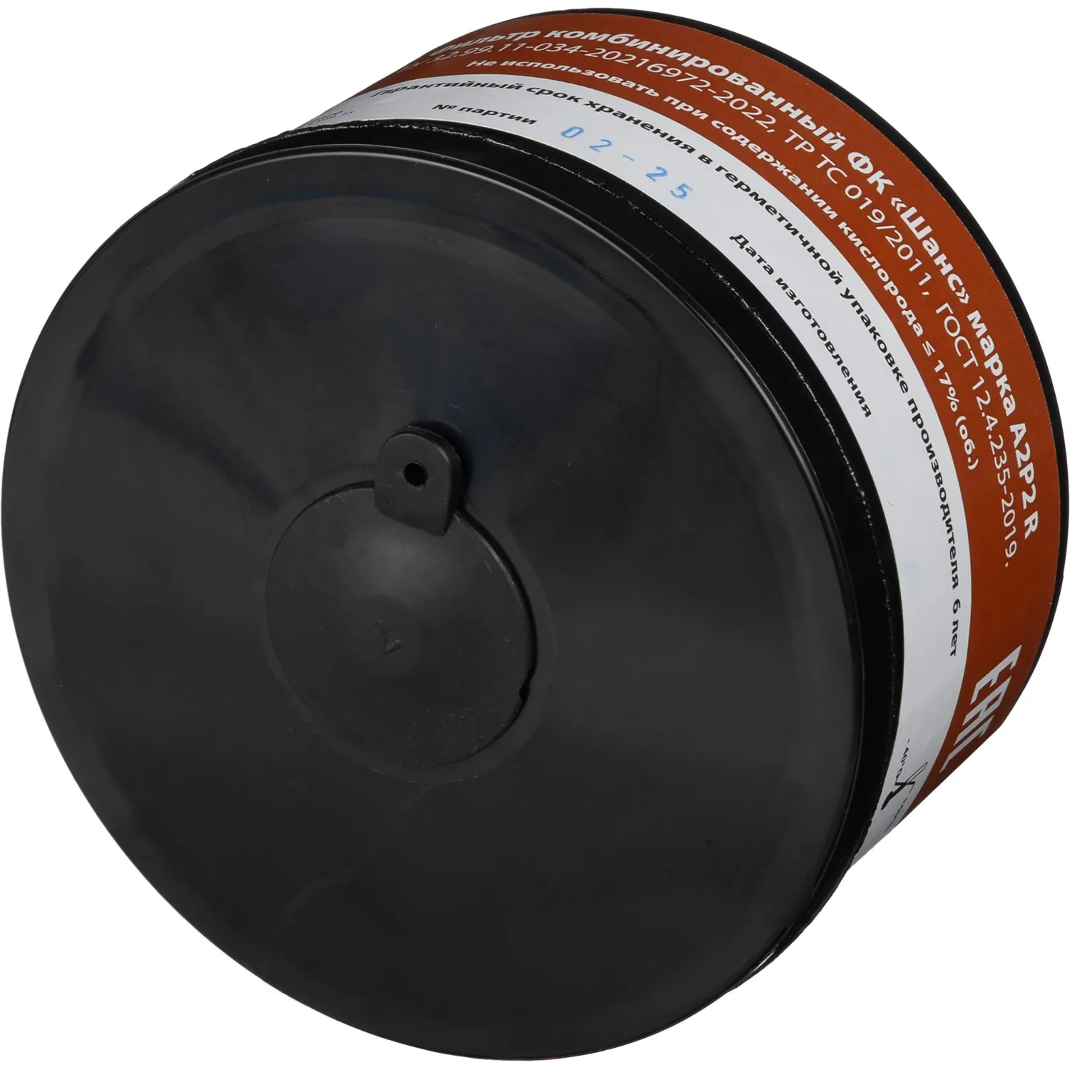 Фильтр комбинированный ФК «Шанс» марки А2Р2 R с резьбовым креплением 40×4, соответствующем ГОСТ 8762 для индивидуальной защиты органов дыхания при выполнении работ в атмосфере, загрязненной органическими газами и парами с температурой кипения выше 65°С (краски, лаки, ацетон, органические растворители, бензин, керосин, дезинфицирующие растворы, органические пропитки, эпоксидная смола) и аэрозолями (пыль, дым, туман), при проведении противоэпидемических работ при загрязнении биологическими аэрозолями. Обеспечивает защиту от радиоактивной пыли.