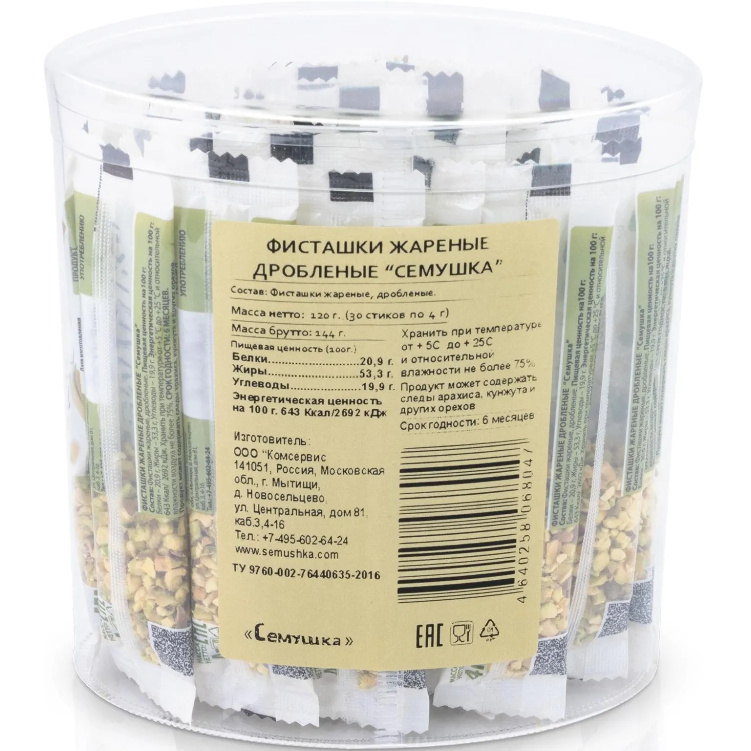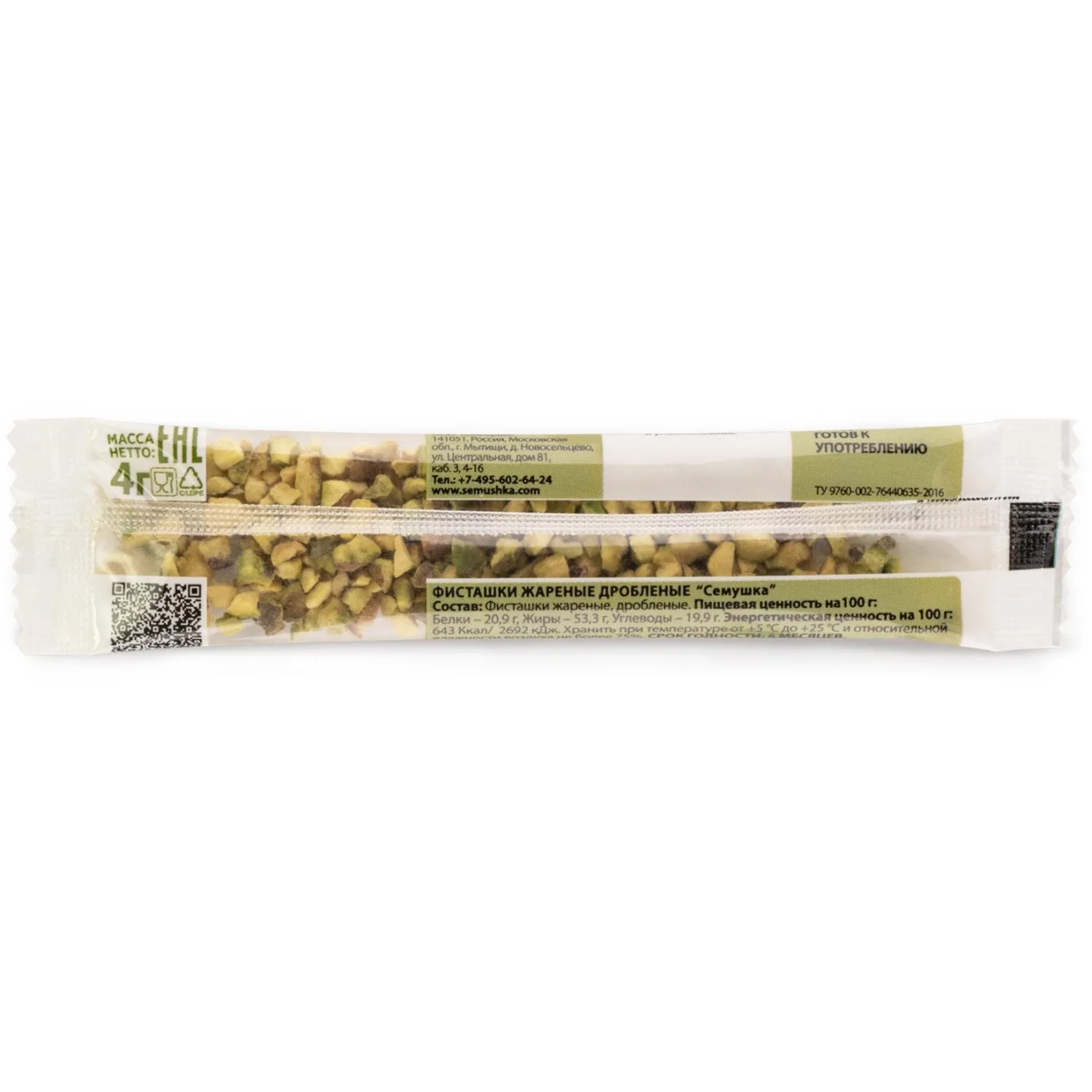 О товаре «Фисташки жареные дробленые Семушка 4гх30шт/уп»