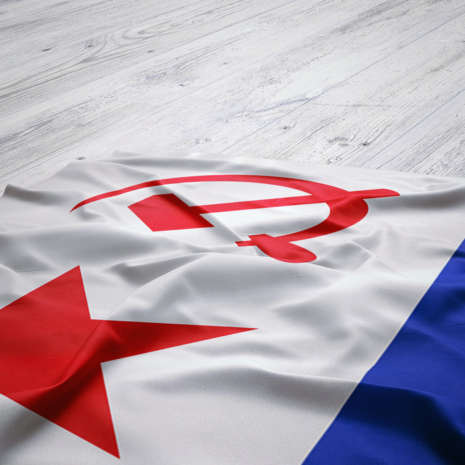 Флаг Военно-Морского Флота СССР представляет полотно с голубой полосой, идущей вдоль нижней кромки флага. На белом полотне размещены: в центре левой половины – красная пятиконечная звезда; в центре правой половины полотна – перекрещённые серп и молот красного цвета. Яркое изображение с двух сторон флага.