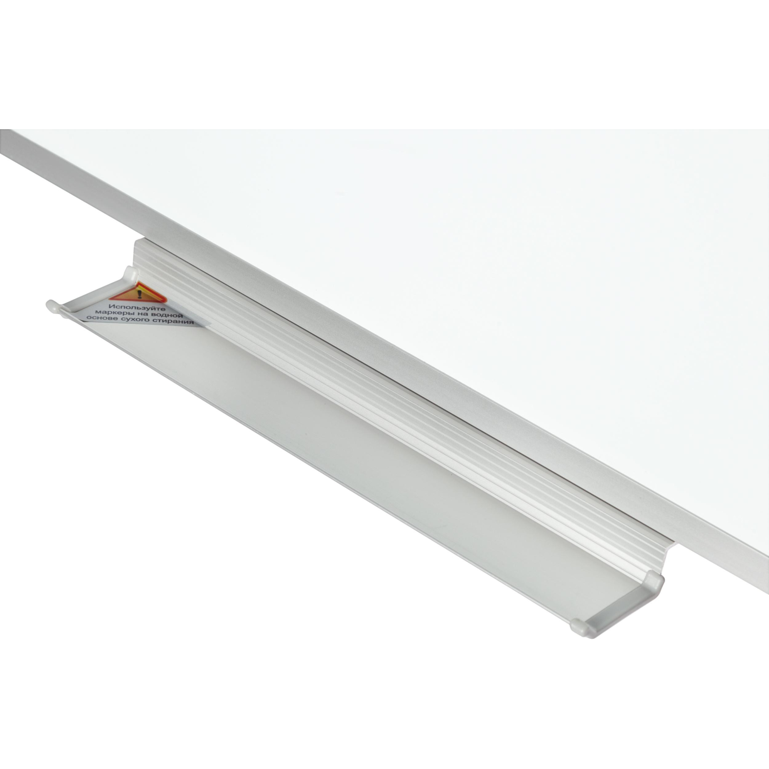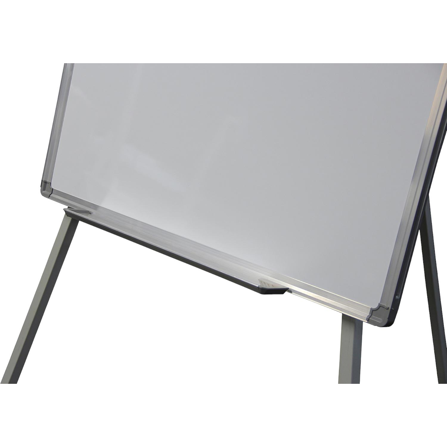 Мобильный флипчарт на треноге с маркерным покрытием. Высота регулируется, треноги имеют специальные винты, которые закручиваются на креплениях у ножек и можно регулировать высоту, до 180 см высота флипчарта (в полностью разложенном виде — чуть ниже, так как ноги будут под наклоном (около 170–175), минимальная высота не указывается так как ноги можно убрать заподлицо флипчарта. Предназначен для работ маркерами сухого стирания. Оснащен держателем для бумажного блокнота. Флипчарт, на который монтируется доска, выполнены из профиля прямоугольного сечения. Алюминиевая рама. На стойку нанесена порошковая покраска серого цвета. В комплект входит полочка для маркеров. Расширение треноги — 64 см. Для удаления пленки потяните за верхний свободный угол, пленка легко отойдет от рабочей поверхности. При необходимости проведите вдоль рамы канцелярским ножом.