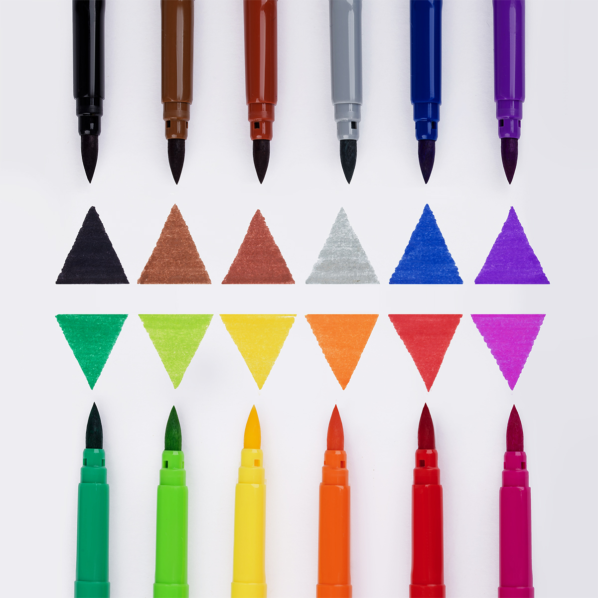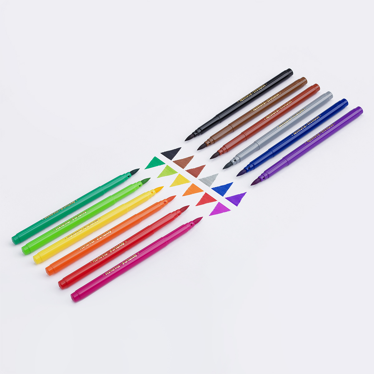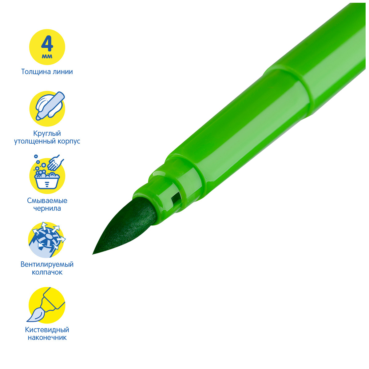Фломастеры «Мульти-Пульти» серии «Невероятные приключения» представлены со смываемыми чернилами, вентилируемым колпачком и кистевидным наконечником. Длина письма – до 320 метров. Толщина линии письма составляет 4 мм. В наборе 12 ярких цветов: красный, фиолетовый, оранжевый, зелёный, чёрный, светло-коричневый, голубой, салатовый, тёмно-коричневый, серый, жёлтый, сиреневый. Утолщённый корпус круглой формы из полипропилена имеет удобную круглую зону захвата. Разная толщина линии и возможность рисовать, как настоящей кистью, обязательно понравятся юному художнику. Фломастеры подходят для детей старше 3-х лет. Смываемые чернила на водной основе. Набор фломастеров упакован в пластиковую прозрачную упаковку с интересным дизайном и европодвесом.