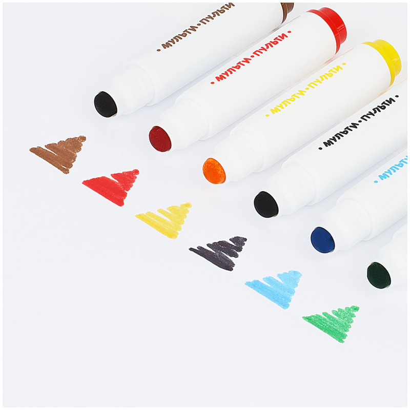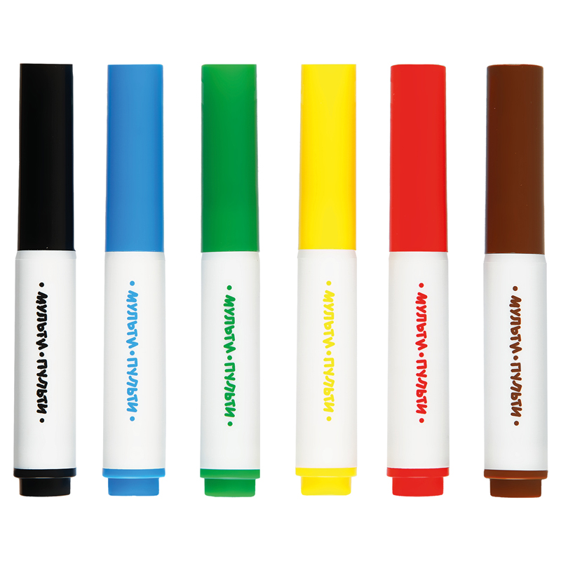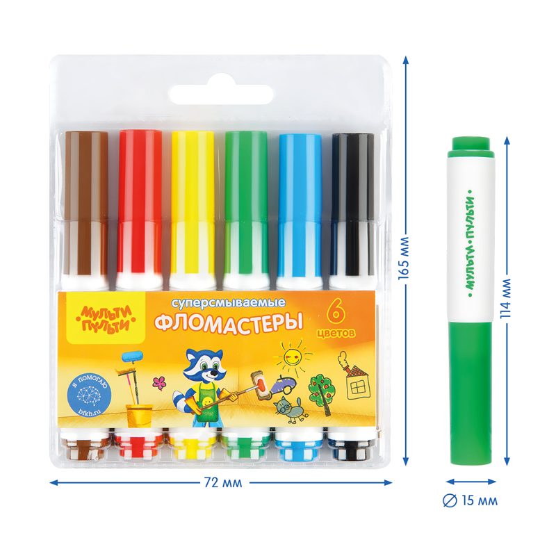 Фломастеры «Мульти-Пульти» серии «Приключения Енота» представлены со смываемыми чернилами, вентилируемым колпачком и утолщённым корпусом. Длина письма – 300 метров. Толщина линии письма составляет 8 мм. В наборе 6 ярких цветов: красный, жёлтый, голубой, зелёный, коричневый, чёрный. Утолщённый корпус круглой формы имеет удобную зону захвата. Тип наконечника – конический. Пишущий узел защищен от продавливания. Фломастеры подходят для детей старше 3-х лет. Чернила на водной основе нетоксичны и легко смываются водой и мылом. Набор фломастеров упакован в блистер с европодвесом.