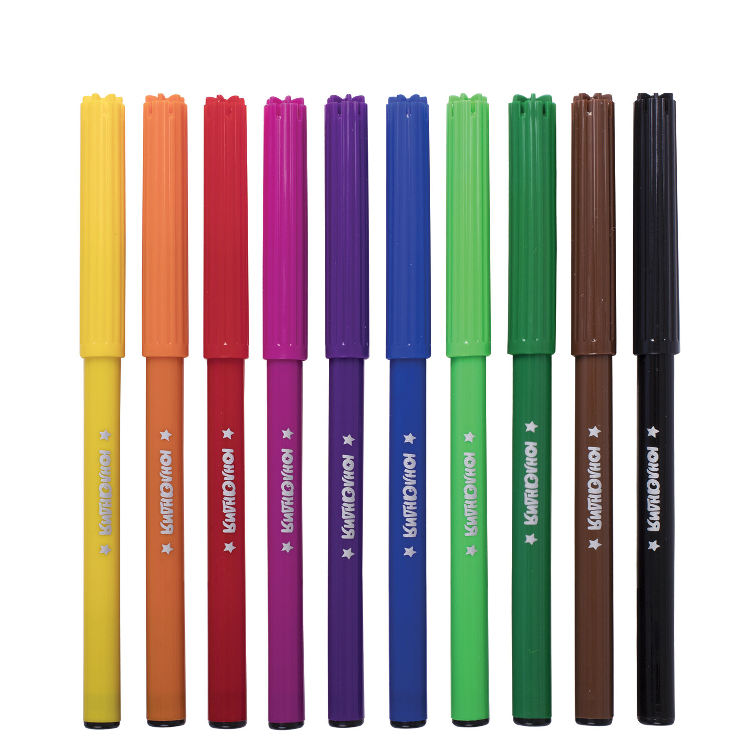 Обладают яркими насыщенными цветами в количестве 10 штук. Удобная круглая форма корпуса, длина которого 139 мм, а диаметр - 8,5 мм. Благодаря толщине линии письма 1 мм и диаметру пишущего узла 2,1 мм процесс раскрашивания становится легким. Длина письма составляет 600 м: такого расхода хватит надолго. Фломастеры изготовлены на водной основе, поэтому они безопасны и легко смываются с большинства материалов и кожи. Наконечник, устойчивый к продавливанию, не проваливается внутрь корпуса и не деформируется даже при сильном нажатии. Полипропиленовый корпус значительно продлевает срок службы фломастеров. Колпачок оснащен специальными прорезями для вентиляции, которые делают использование фломастеров более безопасным. Рекомендованы для детей от 3-х лет.
