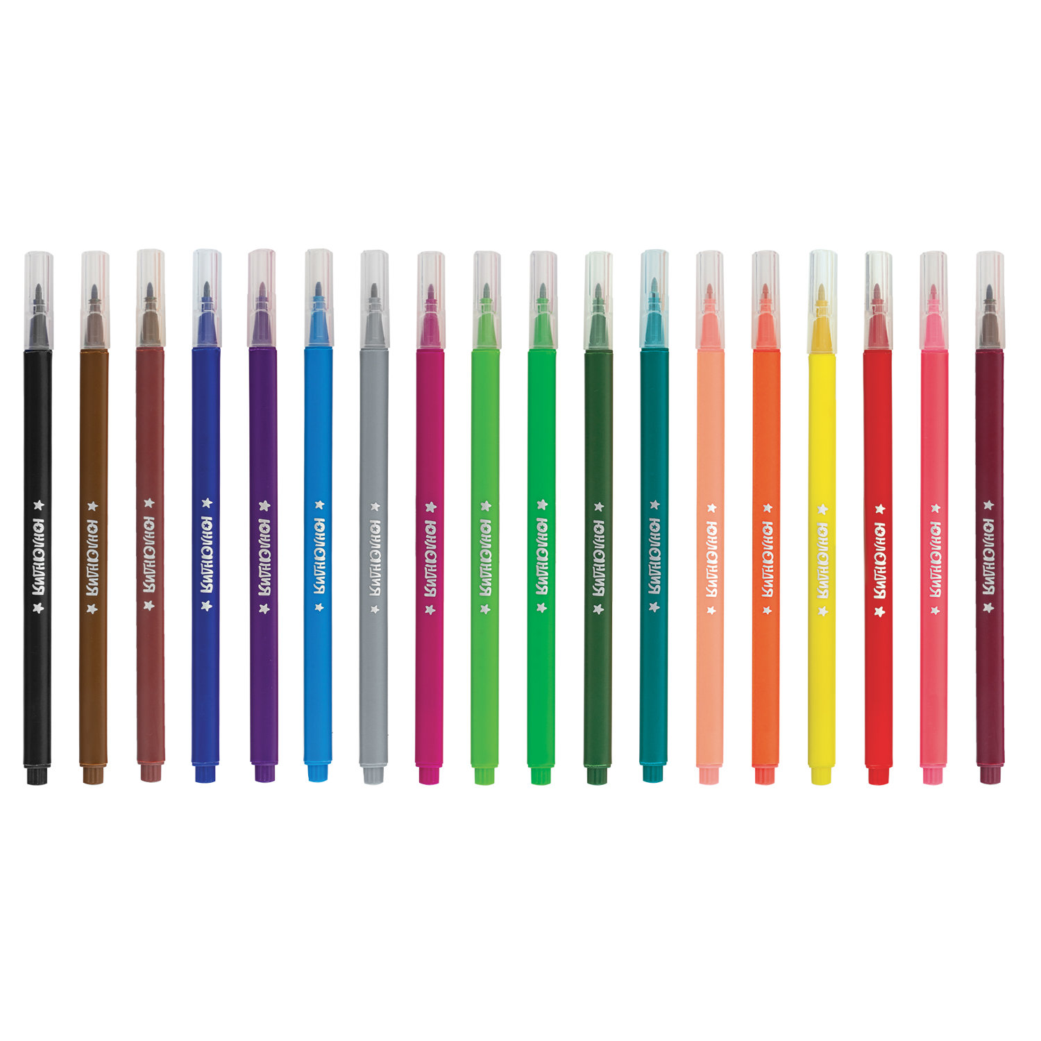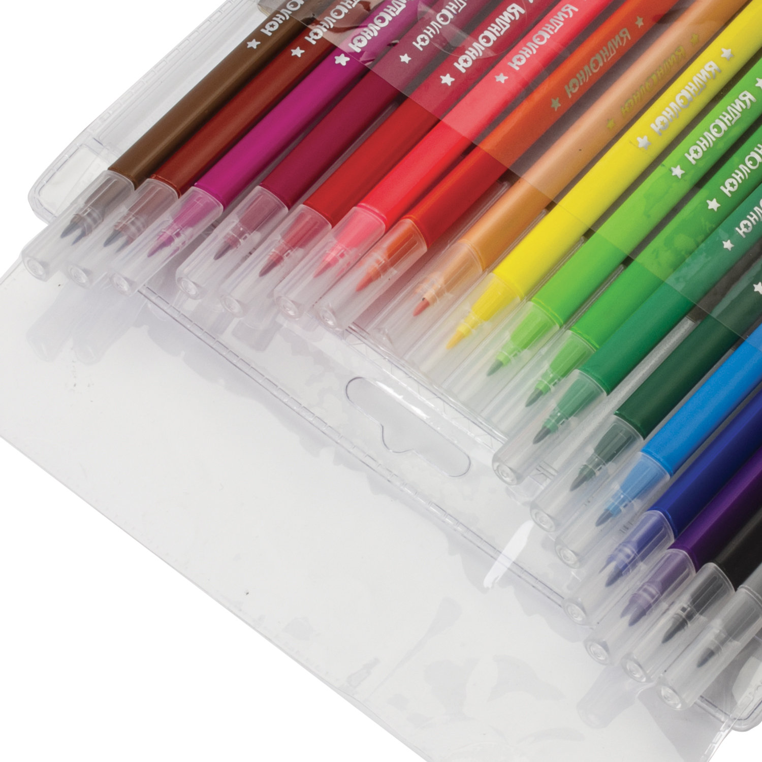 Обладают яркими сочными цветами в количестве 18 штук. Имеют трехгранную форму корпуса, длина которого 165 мм, а диаметр - 8,5 мм. Благодаря удобной трехгранной форме захвата, толщине линии письма 1 мм и диаметру пишущего узла 2,2 мм процесс раскрашивания становится легким и приятным. Длина письма составляет 500 м: такого расхода хватит надолго. Фломастеры легко смываются с большинства материалов и кожи. Наконечник, устойчивый к продавливанию, не проваливается внутрь корпуса и не деформируется даже при сильном нажатии. Полипропиленовый корпус значительно продлевает срок службы фломастеров. Колпачок оснащен специальными прорезями для вентиляции, которые делают использование фломастеров более безопасным. Рекомендованы для детей от 3-х лет.