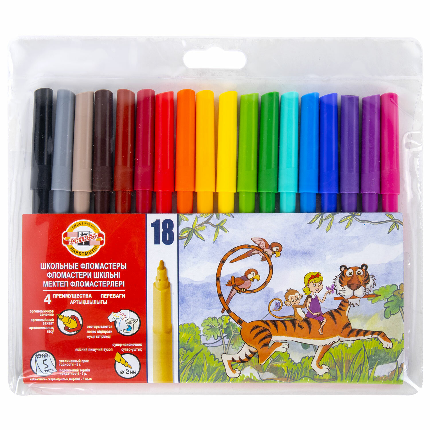 Фломастеры KOH-I-NOOR, 18 цветов, смываемые, трехгранные, пластиковая упаковка, европодвес, 771002AH04TERU