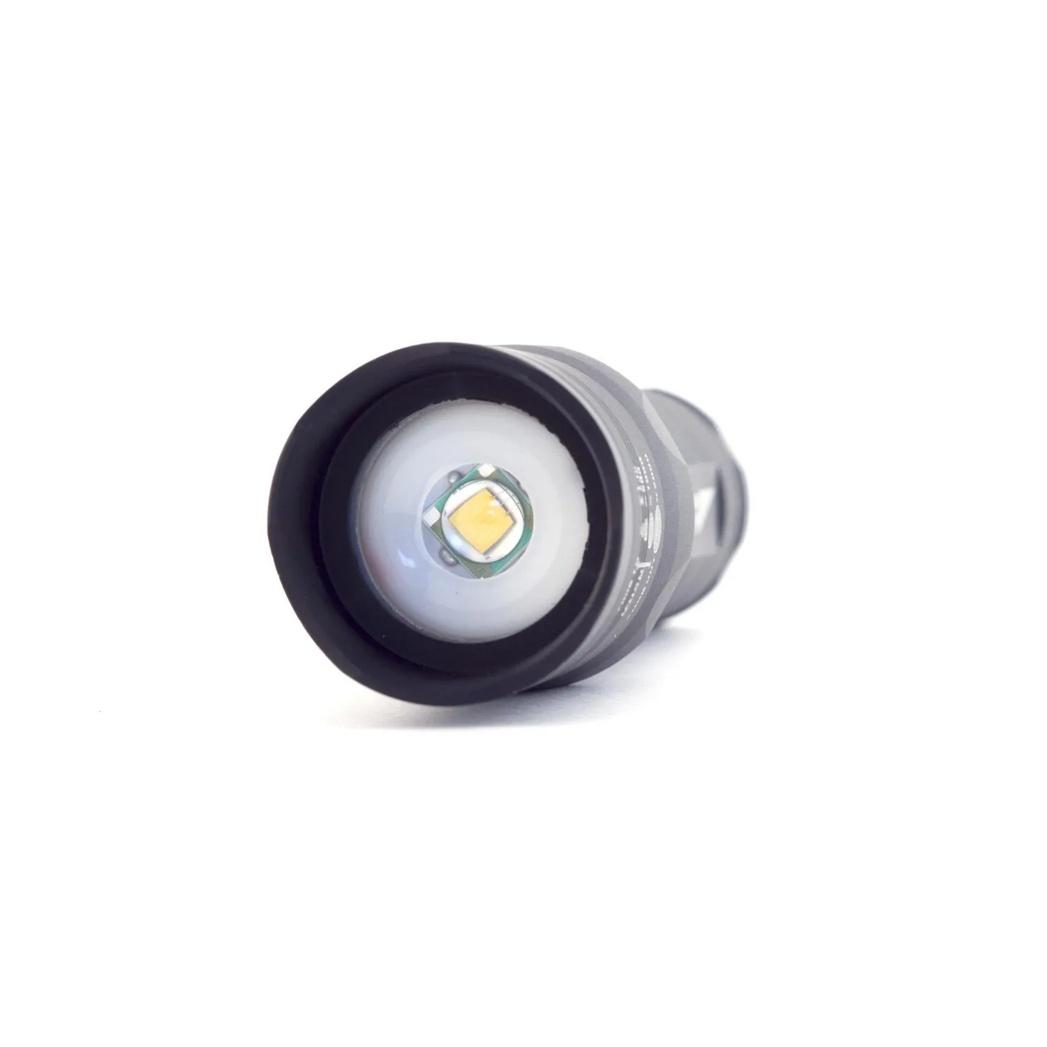 Ручной светодиодный фонарь с корпусом из металла в сером цвете оснащён регулируемой системой Zoom-фокусировки: одним движением можно преобразовать узкий концентрированный луч в широкий заливной свет. Он излучает нейтральный белый свет с цветовой температурой 3700 К и световым потоком 300 лм. Дальность луча составляет 116 м.