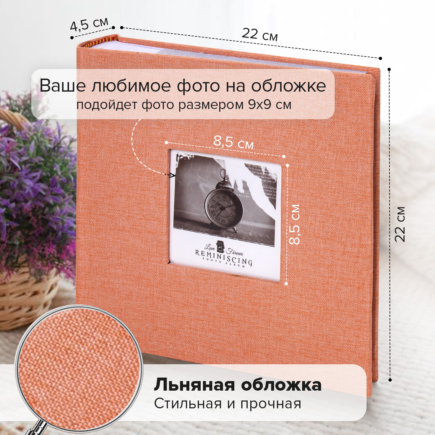 Состоит из 50 бумажных листов размером 15,5х21 см с карманами и вмещает 200 фотографий размером 10х15 см по 2 штуки на странице. Обложка фотоальбома выполнена из текстильного материала персикового цвета. Фотоальбом с книжным переплетом отличается повышенной прочностью и долгим сроком службы. Размер - 22х22 см. Размер окошка под фото на обложке - 8,5х8,5 см.