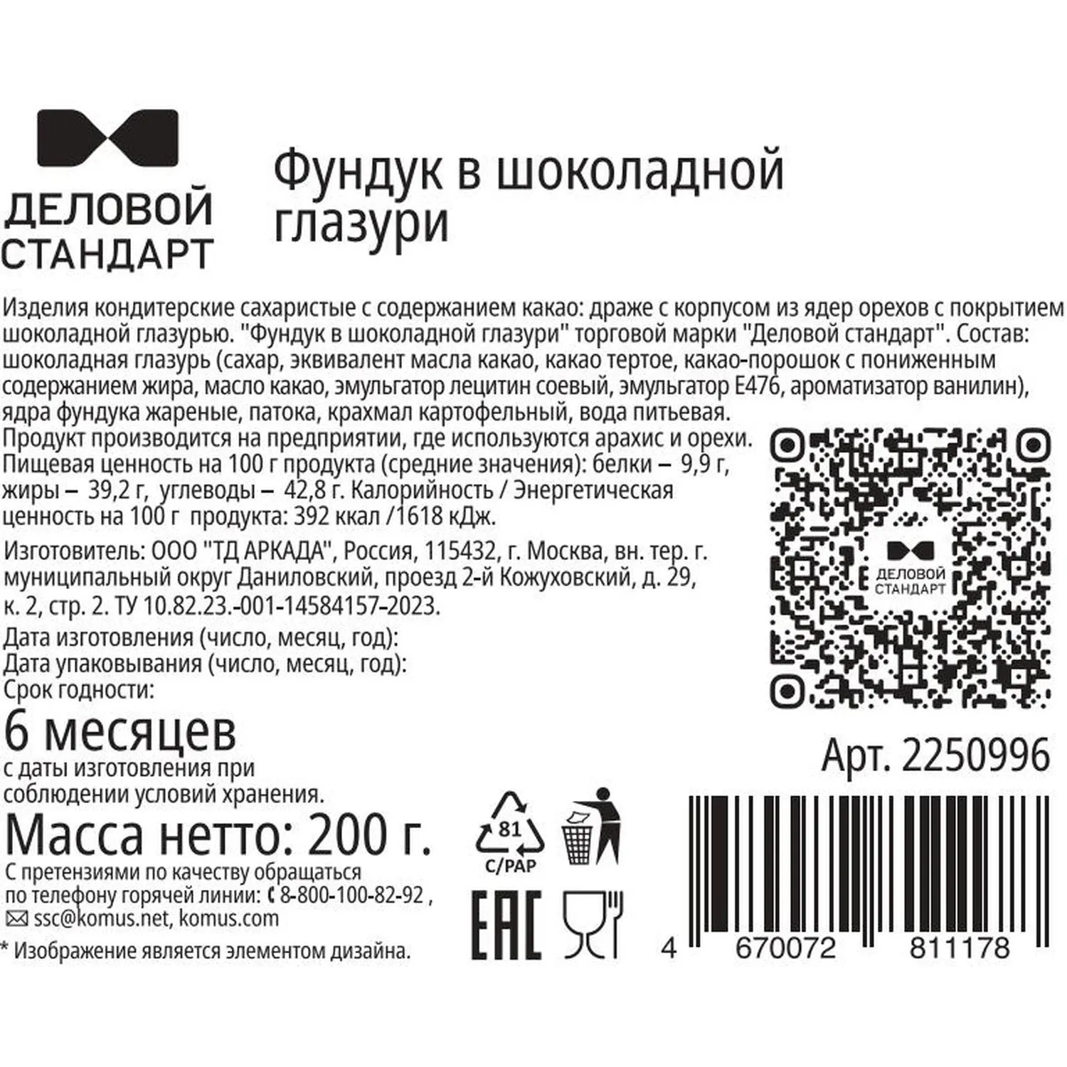 О товаре «Фундук Деловой Стандарт в глазури, 200г»