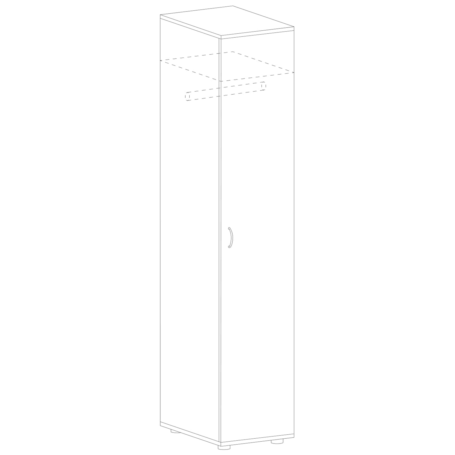 Узкий гардероб Агат с правосторонней дверью выполнен из ламинированной деревоплиты (ЛДСП) серого цвета. Имеет штангу для одежды, установленную параллельно задней стенке, и навесную полку для головных уборов. Кромочная лента из прочного ПВХ предназначена для защиты от повреждений и разбухания.