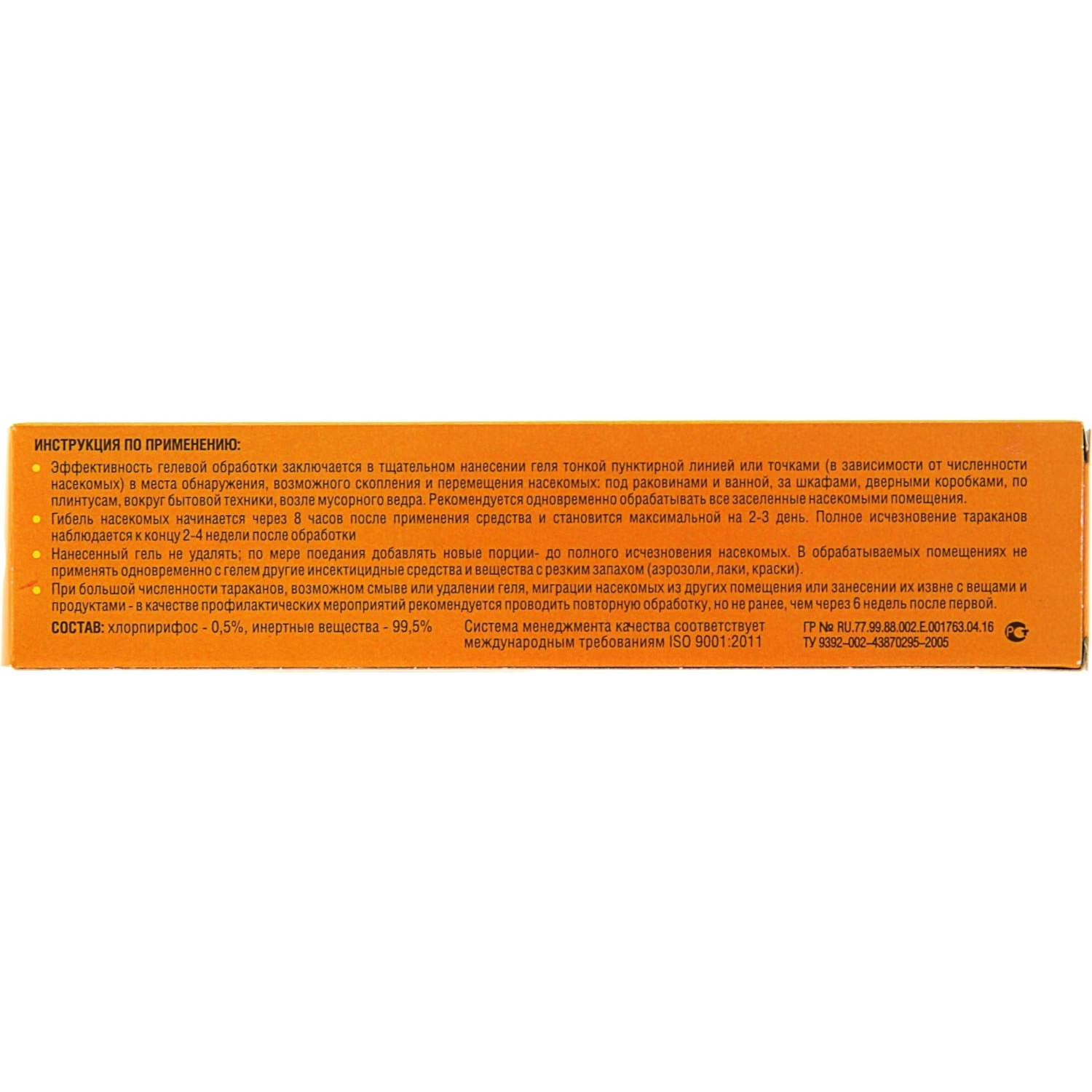 Способ применения: Эффективность обработки заключается в тщательном нанесении геля тонкой пунктирной линией или точками, в зависимости от численности насекомых, в места их обнаружения, возможного скопления и перемещения. Обрабатывайте участки под раковинами, ваннами, за шкафами, дверными коробками, по плинтусам, вокруг бытовой техники, возле мусорных вёдер. Рекомендуется одновременно обрабатывать все помещения, заселённые насекомыми. Гибель насекомых начинается через 8 часов после применения средства и становится максимальной на 2–3 день. Полное исчезновение тараканов наблюдается через 2–4 недели после обработки. Нанесённый гель не нужно удалять; по мере его поедания добавляйте новые порции до полного исчезновения насекомых.