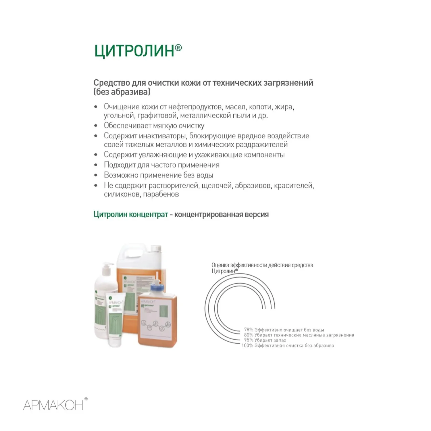 Очищающий гель Армакон Цитролин представляет собой средство для очистки кожи от технических загрязнений, не содержит абразива и позволяет легко удалить загрязнения технического характера (нефтепродуктов, масел, копоти, жира, угольной, графитовой, металлической пыли) с кожи. Благодаря комбинации мягких и безопасных ПАВ, средство наносится эффективно очищает кожу, не травмируя ее. Содержит инактиваторы, нейтрализующие вредное воздействие солей тяжелых металлов и химических раздражителей. Эффективность подтверждена научными исследованиями. Эффективно в воде любой жесткости; возможно применение без воды. В состав включены увлажняющие и ухаживающие компоненты (олеиновая кислота, пропилен гликоль, ланолин). Средство подходит для частого использования. Обладает приятным ароматом. Не содержит растворителей, щелочей, абразивов, красителей, парабенов. Применение: нанести на сухую кожу, хорошо втереть, затем смыть большим количеством воды. Упаковка: флакон для дозатора 1000мл. Условия хранения: избегать попадания прямых солнечных лучей. Срок годности от даты изготовления 24 месяца. Подходит к дозатору для средств защиты кожи Армакон Топфит (артикул 961989). Соответствует стандартам ТР ТС 019/2011, ГОСТ 31696-2012.
