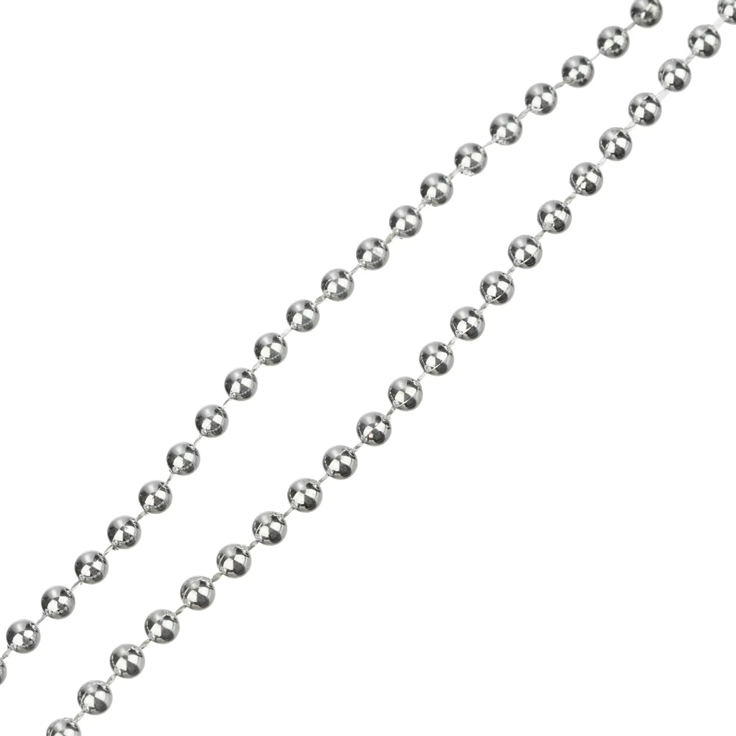 Украшение имеет длину 270 см и ширину бусин 0.5 см. Серебристый оттенок гармонично сочетается с традиционным новогодним декором и подчёркивает атмосферу торжества.
