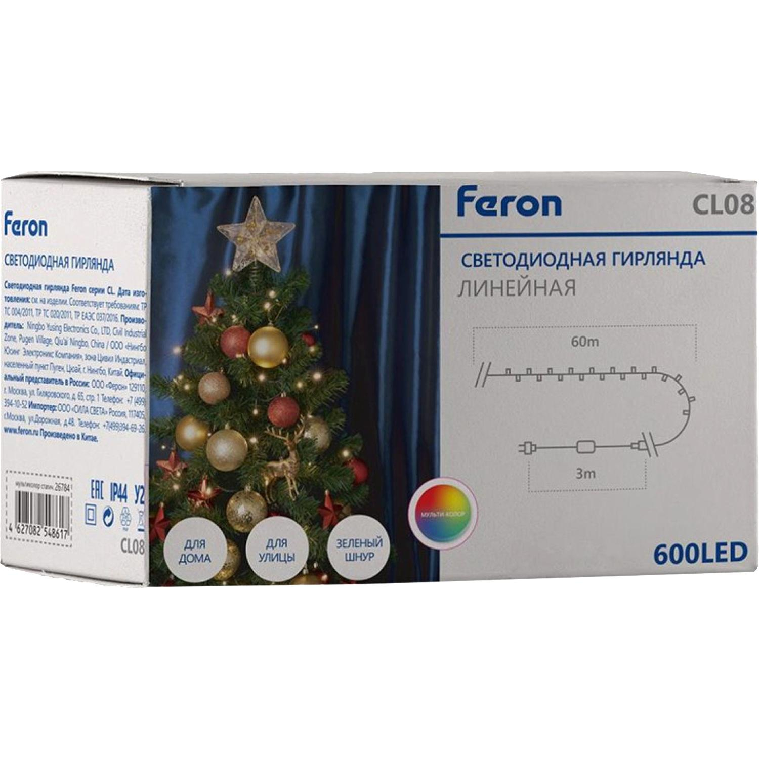 Гирлянда линейная Feron CL08 — длинная и яркая светодиодная гирлянда для использования как внутри помещений, так и на улице под навесом. Общая длина световой линии составляет 60 метров, дополнительно к ней идет 3-метровый зелёный кабель питания.
