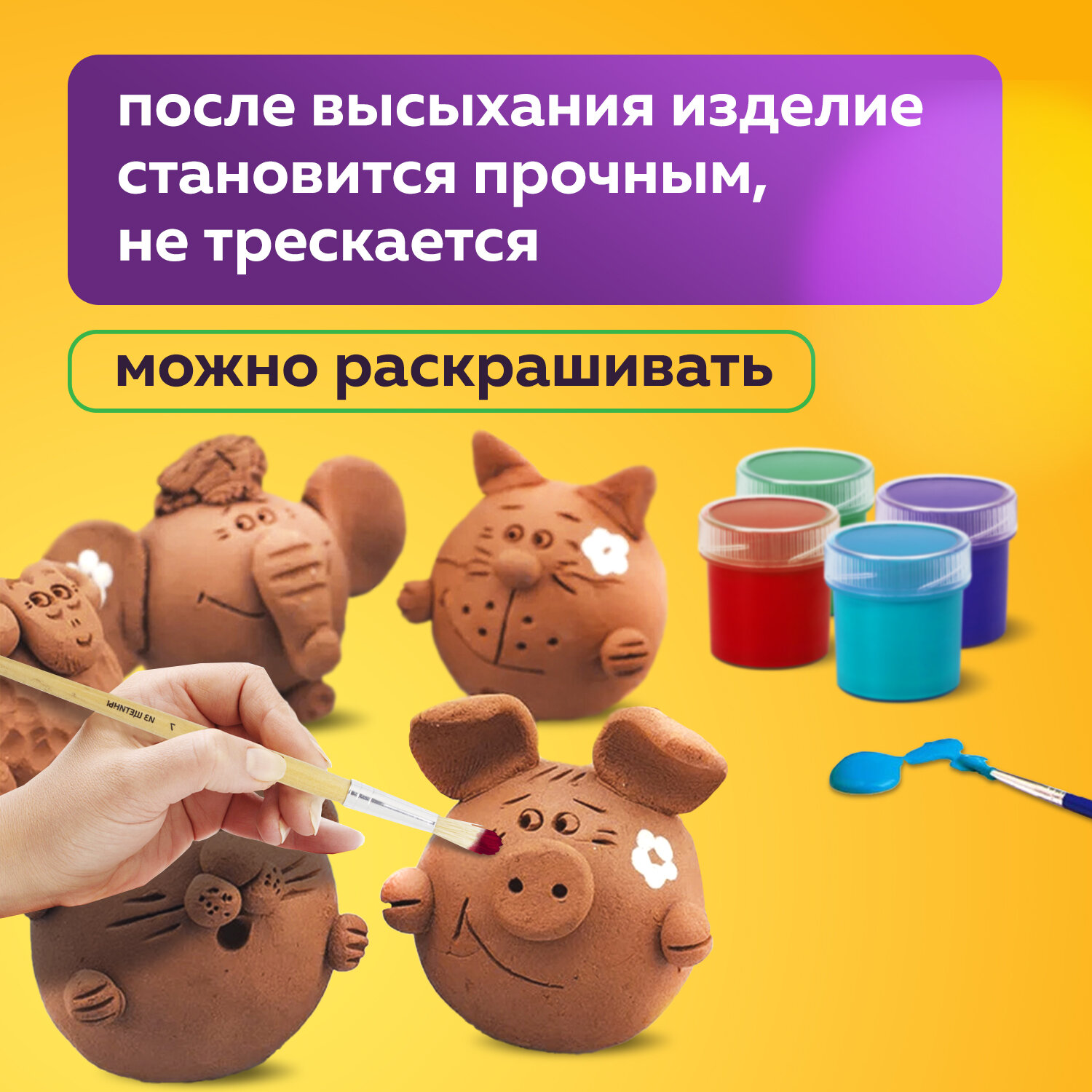 Безопасный и экологичный продукт, не вызывает аллергической реакции. Благодаря самозатвердевающему свойству глины изделия из нее сохнут самостоятельно без участия высоких температур. Для придания изделию стабильности рекомендуется обжиг. Обожженные изделия можно использовать в бытовых целях (например, в качестве посуды). Глина в красном цвете является наиболее востребованной. Вес - 3 кг.