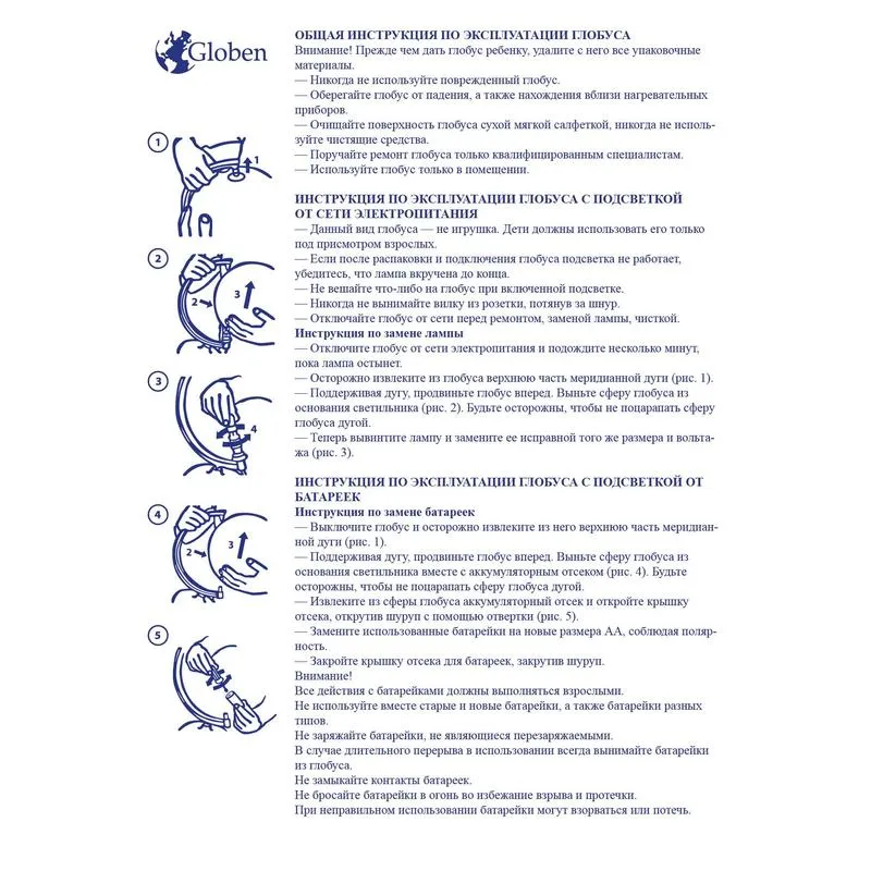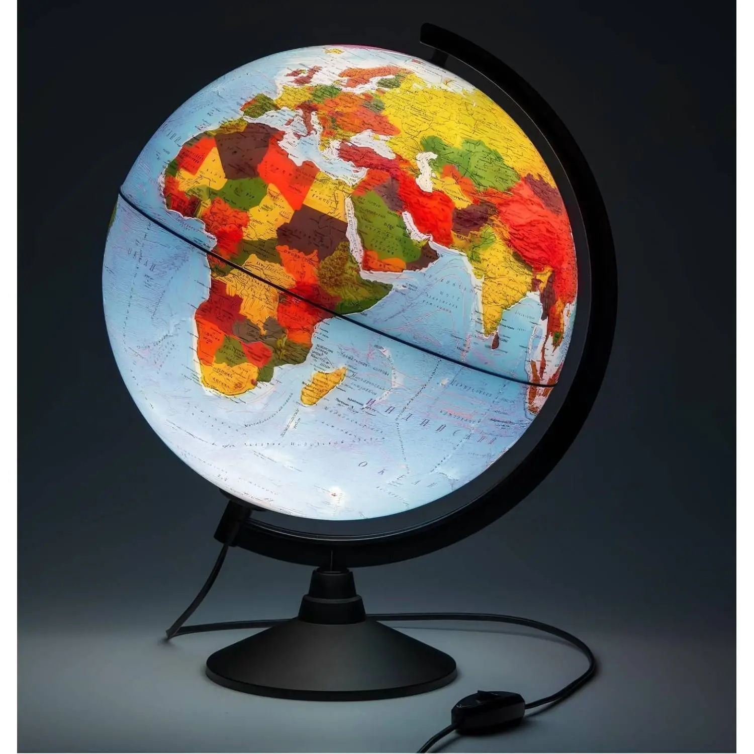 Глобус — идеальное учебное пособие для изучения географии в школе и дома. На карту глобуса нанесены страны мира, названия городов и другая полезная информация. При включении подсветки глобус превращается в наглядную политическую карту: чётко выделяются границы стран, каждая из которых окрашена в свой цвет. В вечернее и ночное время глобус можно использовать как ночник. Патрон Е14, лампа 15 В. Материал изготовления глобуса — пластик. Подставка глобуса выполнена из высококачественного пластика чёрного цвета. Глобус гладкий. Размер глобуса: 44×35 см. Питание от сети, в комплекте поставляется шнур с выключателем.
