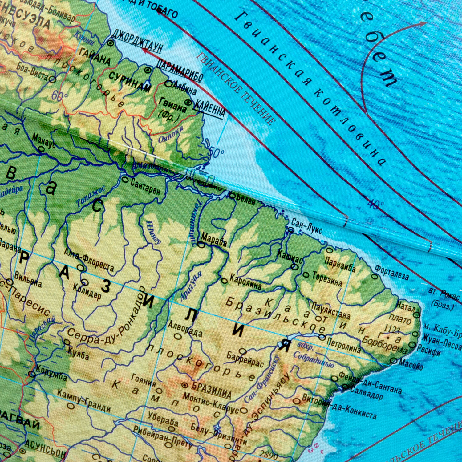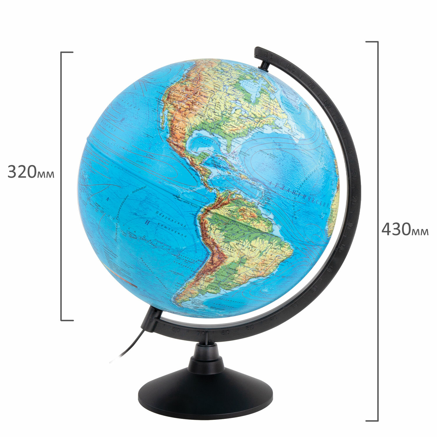 Глобус — идеальное учебное пособие для изучения географии в школе и дома. Сфера изготовлена из пластика. Диаметр сферы 32 см. Устойчивая настольная подставка из пластика. Карта максимально подробная для данного диаметра глобуса. Линия экватора выпуклая для тактильного восприятия. Изображение карты соответствует принятым мировым картографическим стандартам условного обозначения ландшафта и стран. Наличие подсветки позволяет использовать глобус как ночник в вечернее и ночное время. Размер глобуса: 44×35 см. Питание от сети, в комплекте поставляется шнур с выключателем.
