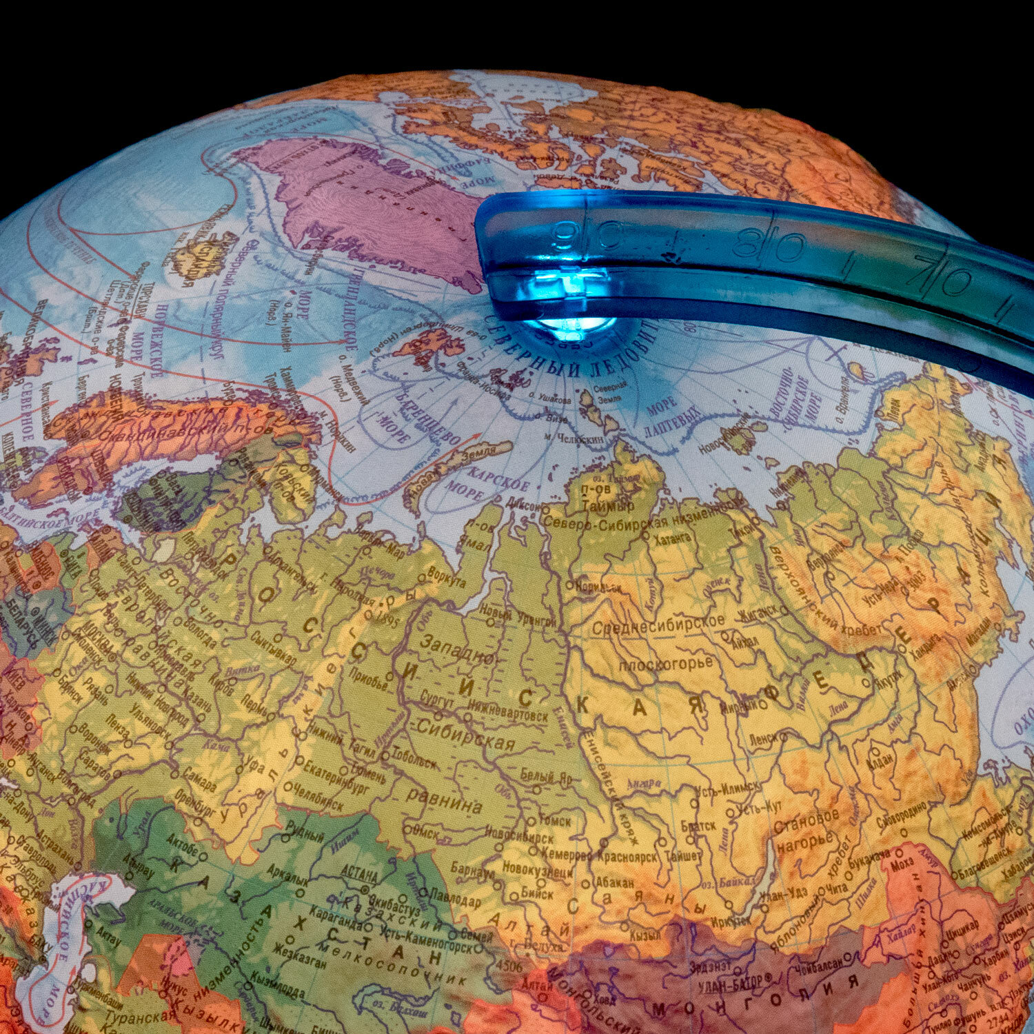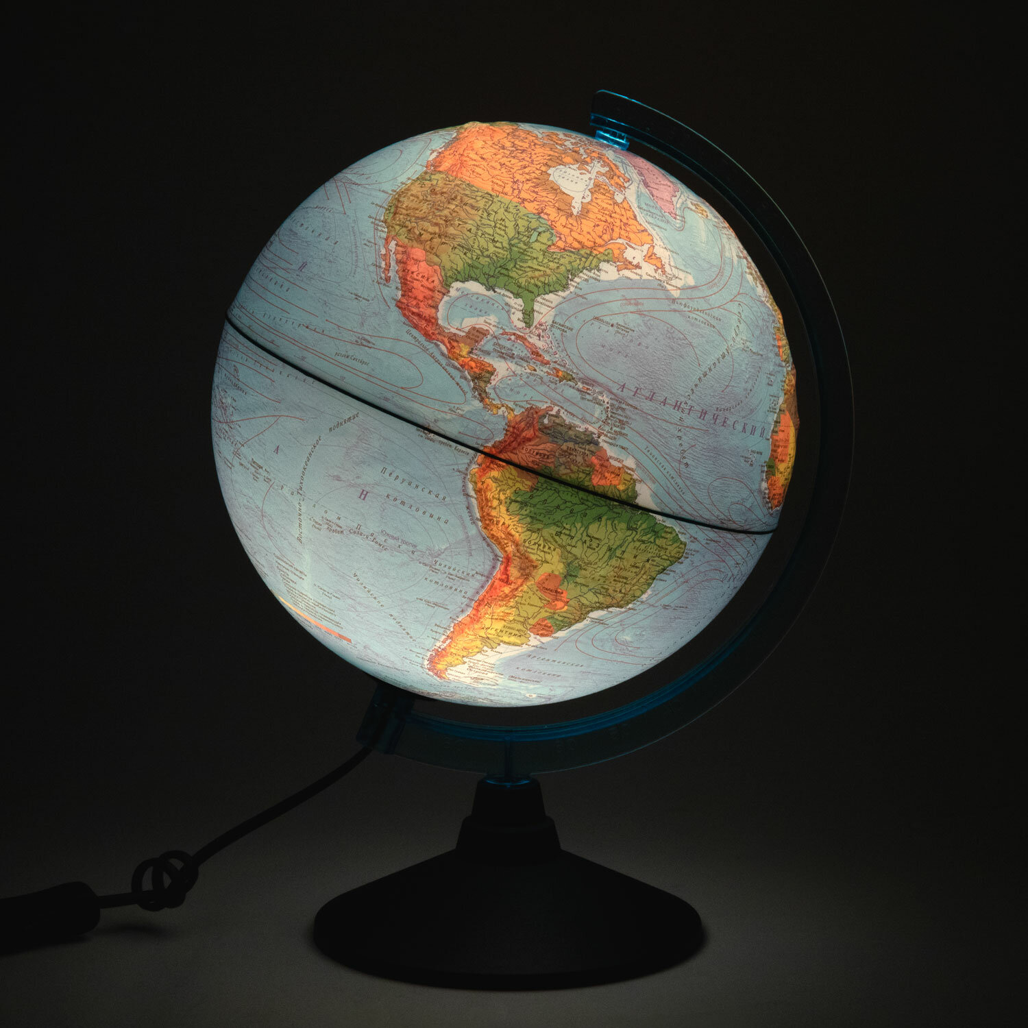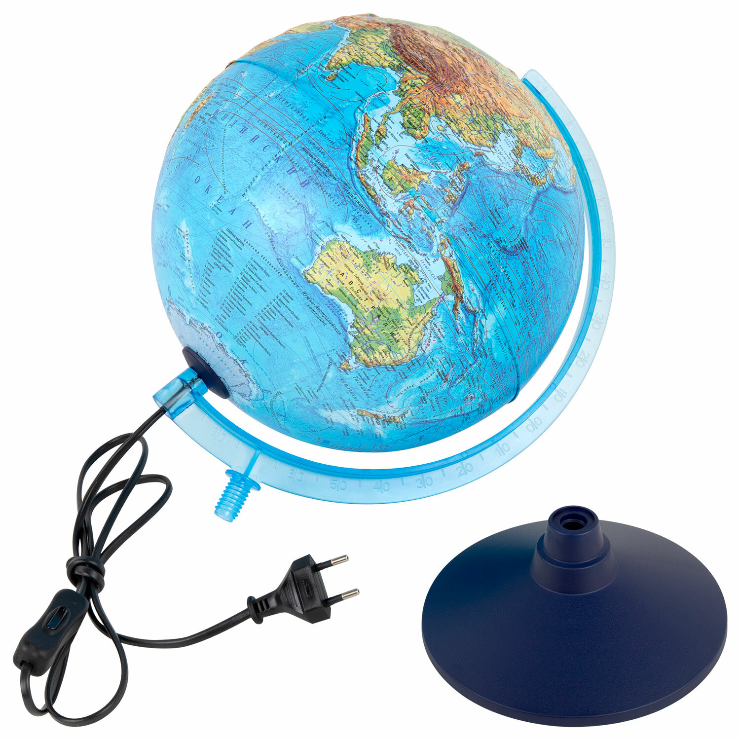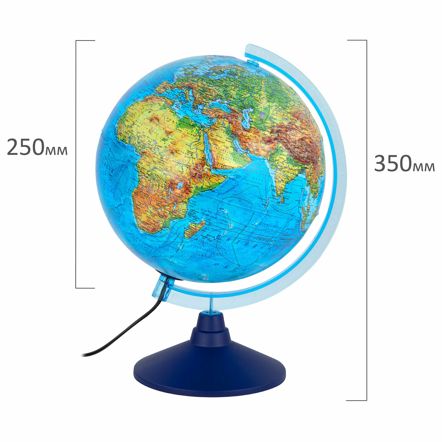 Глобус — идеальное учебное пособие для изучения географии в школе и дома. На карту глобуса нанесены страны мира, названия городов и другая полезная информация, а также детальный рельеф ландшафта. Рельефная поверхность отражена с помощью выпуклостей на поверхности глобуса. При включении подсветки глобус превращается в наглядную политическую карту: чётко выделяются границы стран, каждая из которых окрашена в свой цвет. В вечернее и ночное время глобус можно использовать как ночник. Подставка глобуса выполнена из высококачественного пластика голубого цвета. Размер глобуса: 37×28 см. Питание от сети, в комплекте поставляется шнур с выключателем.