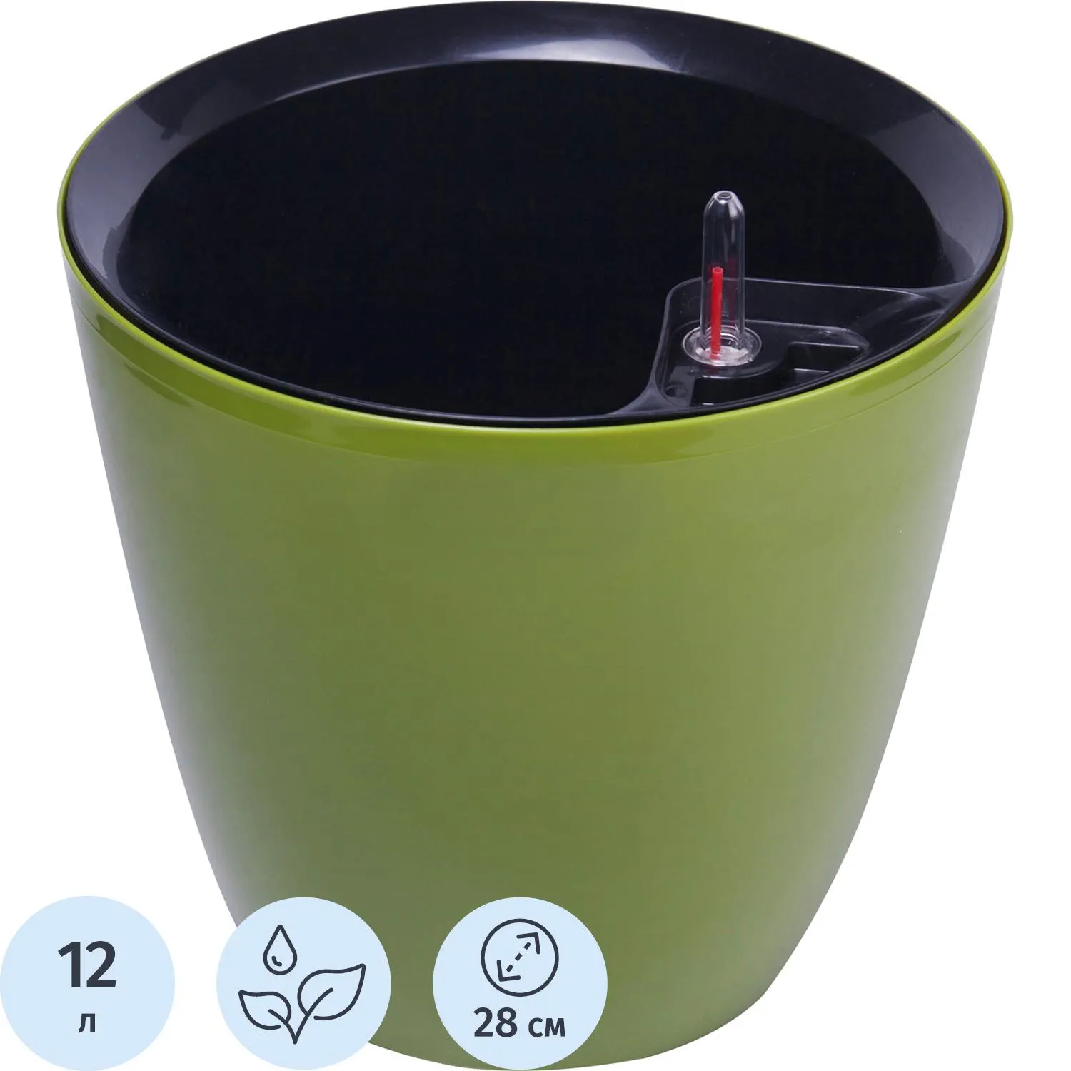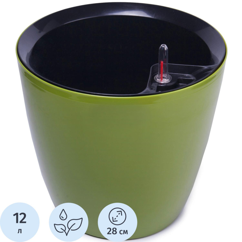 Горшок выполнен из пластика, что придаёт ему лёгкость и долговечность. Общий объём горшка составляет 12 литров, из которых 6 литров занимает внутренняя вставка. Высота горшка — 27 см, ширина — 28 см, а ширина основания — 19 см, что обеспечивает его стабильность. Горшок оснащён индикатором уровня воды и дренажным отверстием, что помогает контролировать полив и избегать застойной воды.