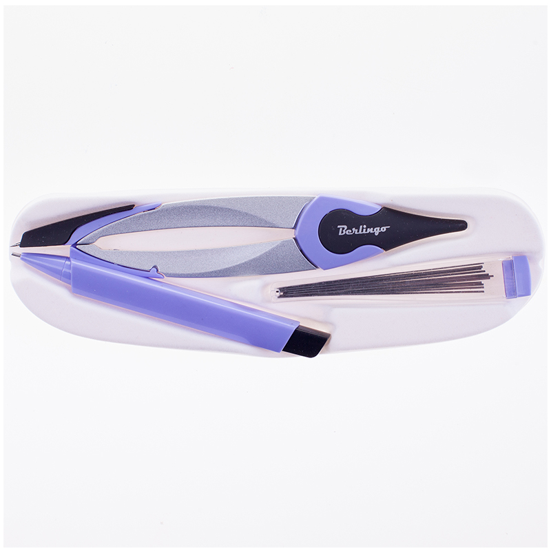 Эргономичная головка/держатель циркуля. В состав набора входит: циркуль с механическим карандашом, запасной грифель для карандаша. В пластиковом пенале.
