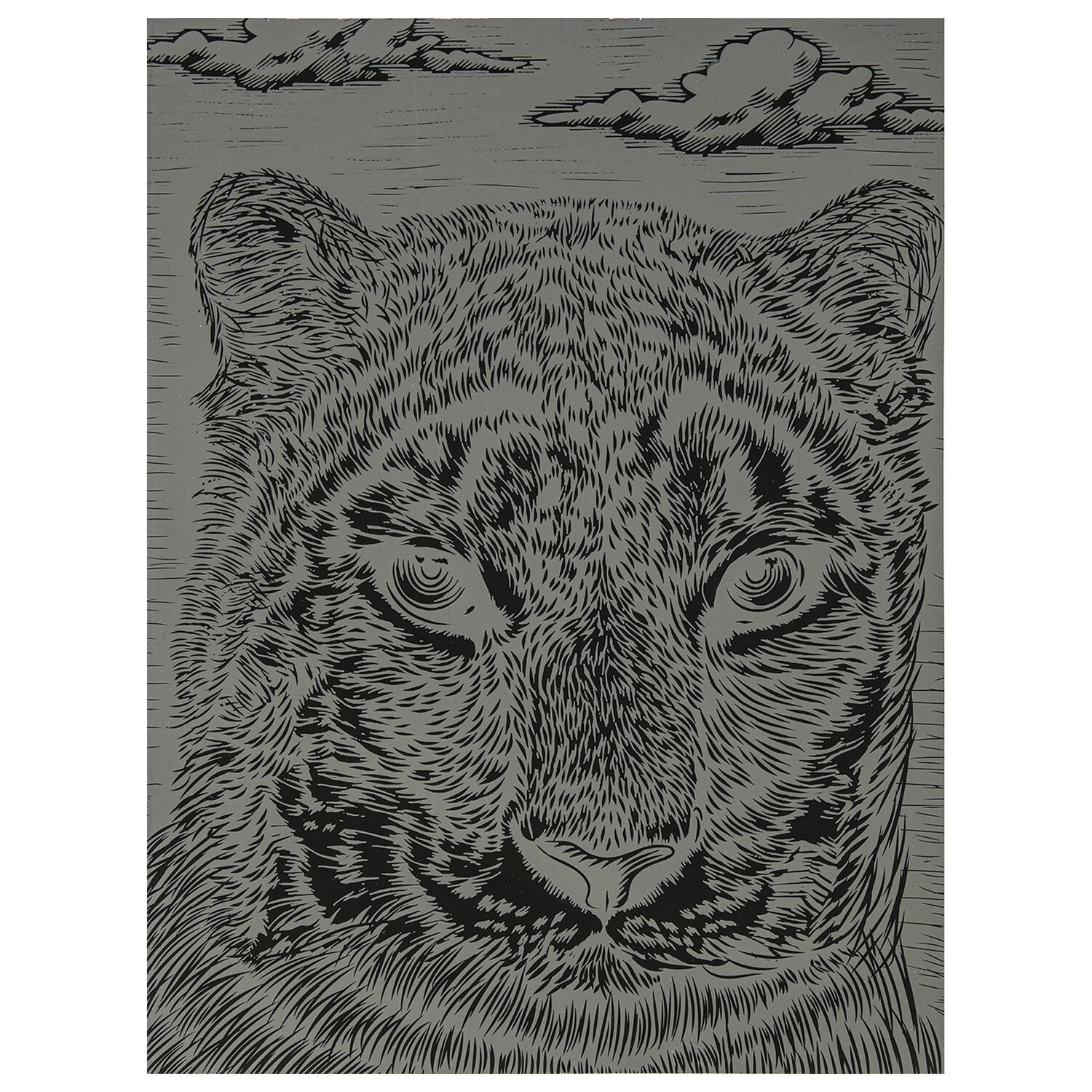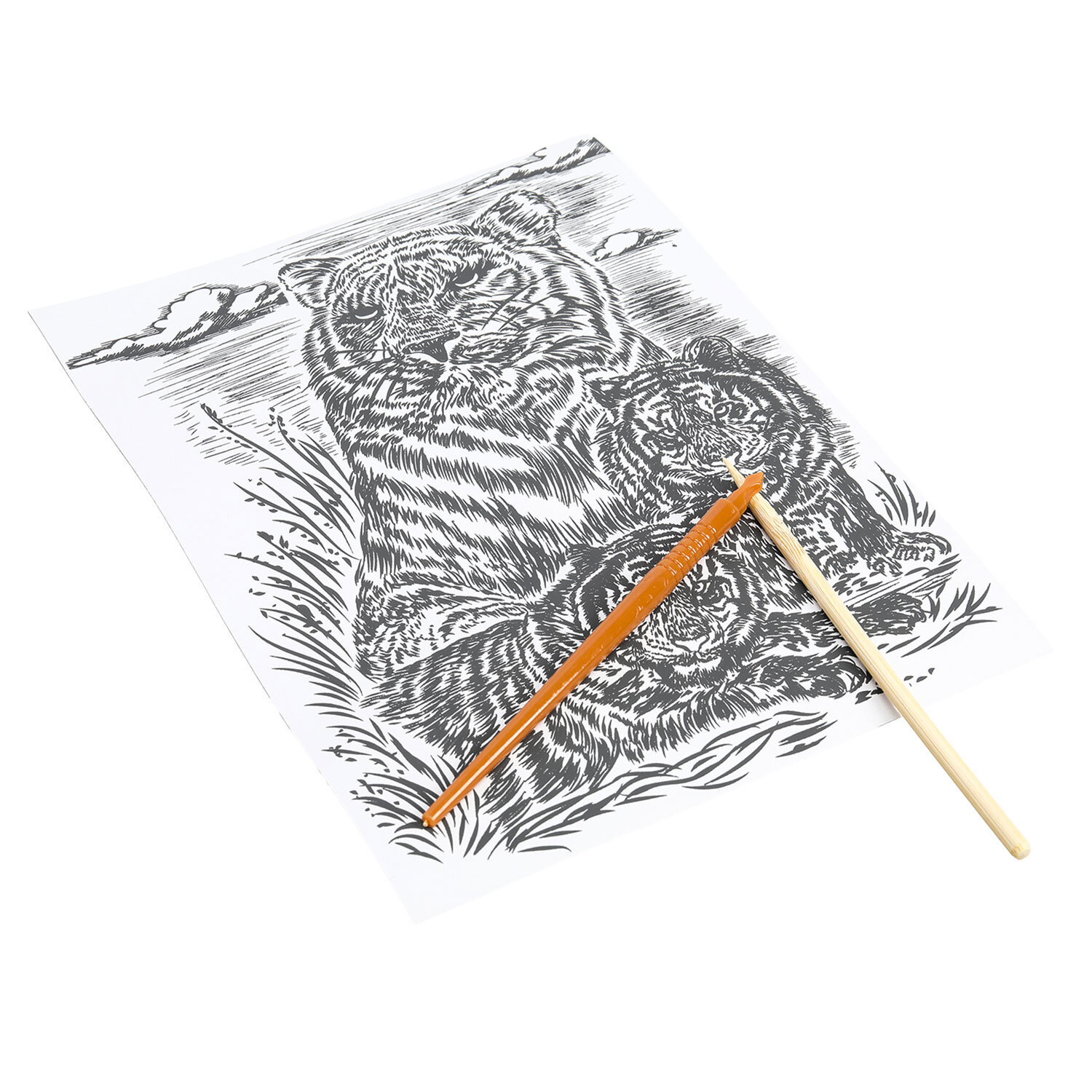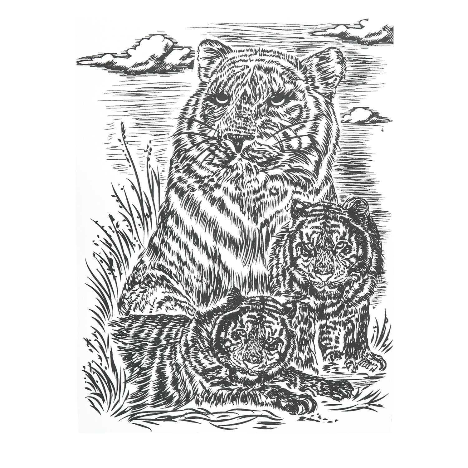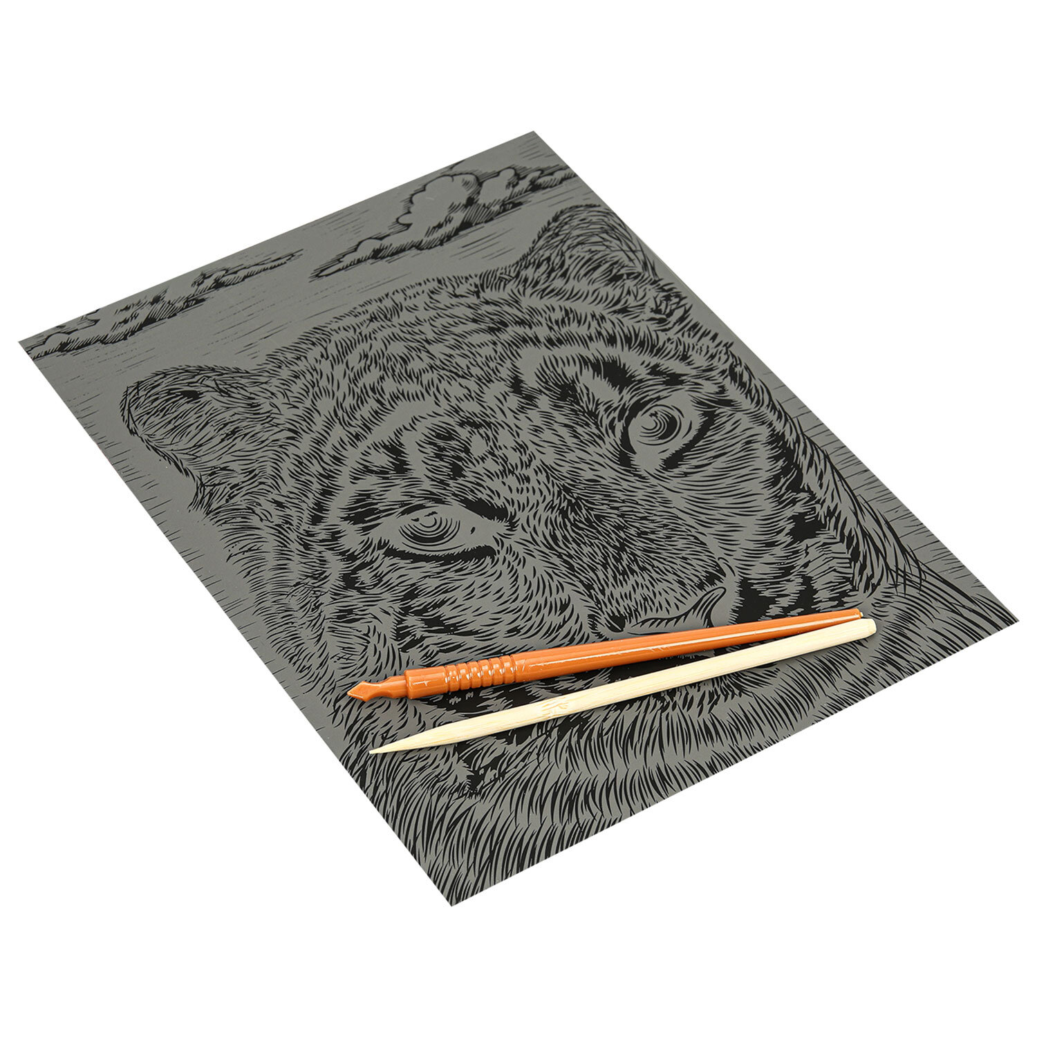 Контур рисунка уже нанесен на черный фон. С помощью специального штихеля изображение процарапывается, из-под слоя краски появляется основа (золотая, серебряная, голографическая). В результате получается контрастный рисунок. Набор содержит все необходимое для создания оригинальной картины: основу с контуром, штихель, инструкцию.