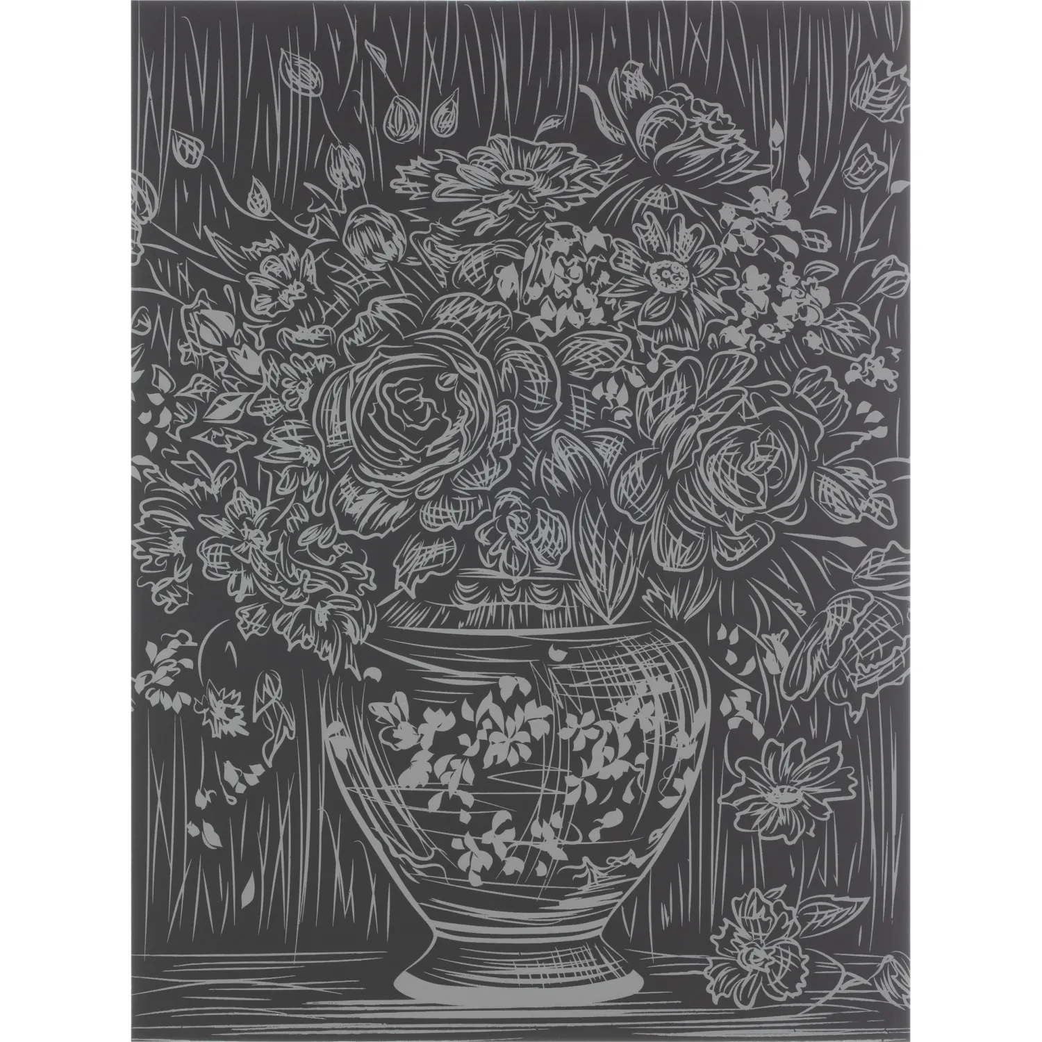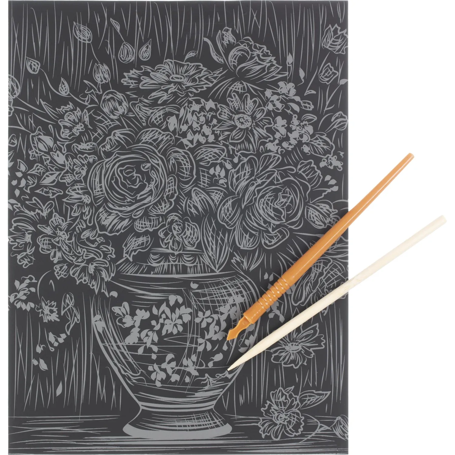 Творческий набор для детей, который развивает мелкую моторику, внимание и художественный вкус. В процессе работы ребёнок с помощью специального штихеля снимает верхний слой покрытия, постепенно открывая яркое изображение цветов.