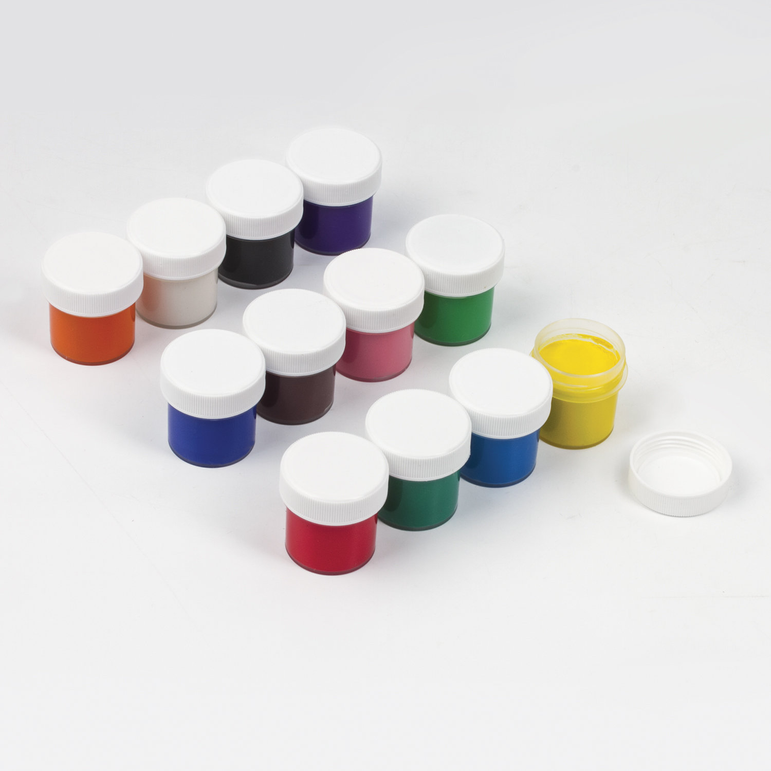В наборе 12 ярких цветов: белый, черный, красный, желтый, синий, зеленый, оранжевый, фиолетовый, светло-зеленый, голубой, розовый, коричневый.