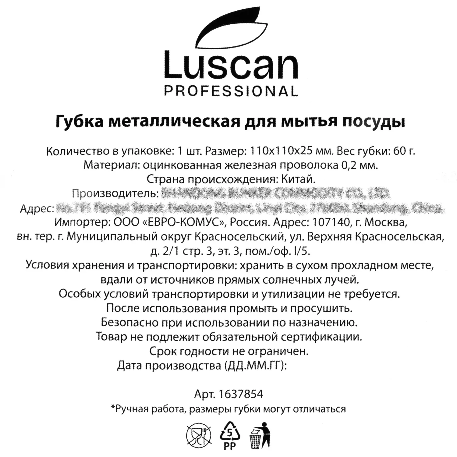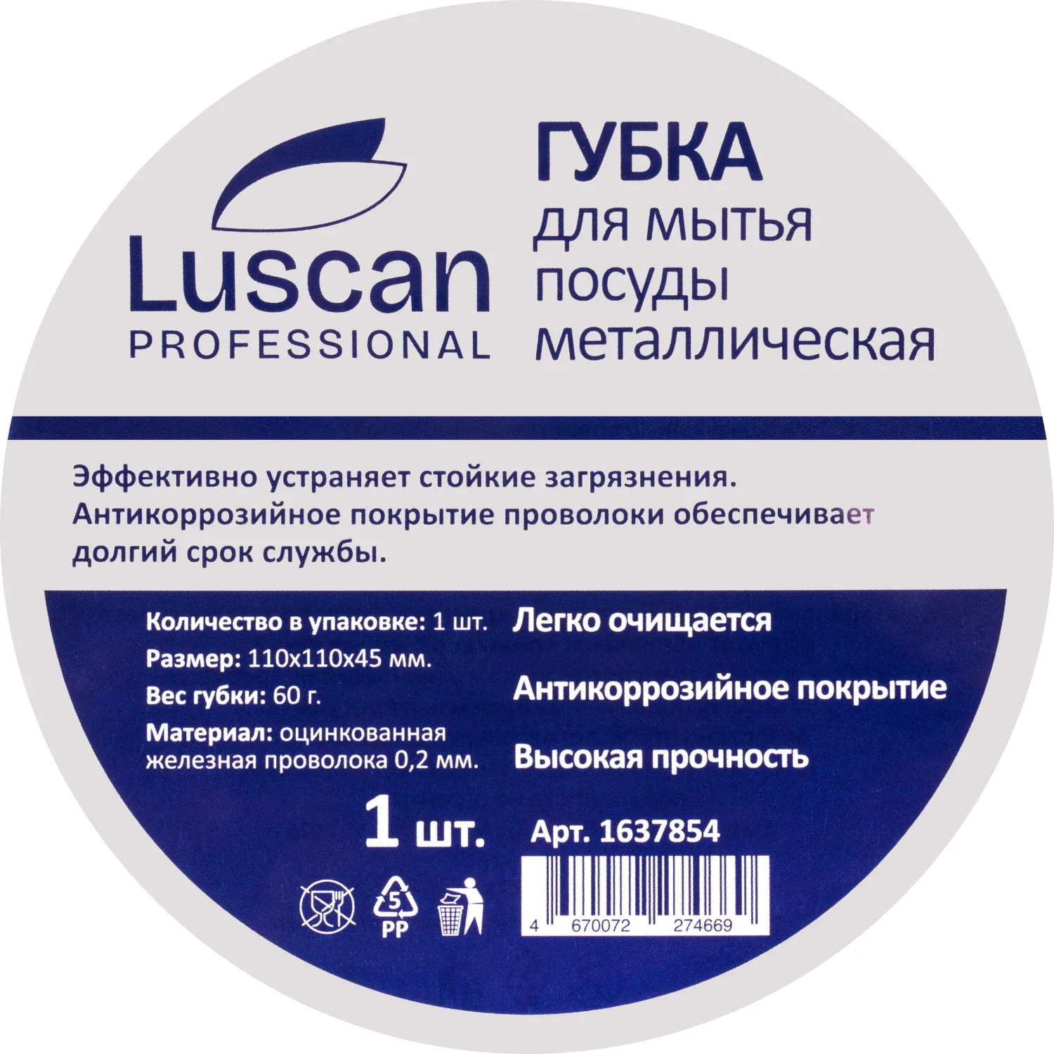 Губка-мочалка Luscan Professional предназначена для эффективной чистки кастрюль, чугунных сковород и противней. Также можно использовать для удаления грязи с керамики, бытовой техники — плит, микроволновых печей, духовок и т. д. Оцинкованная железная проволока, из которой изготовлена мочалка, быстро и качественно удаляет въевшиеся загрязнения. Изделие отличается длительным сохранением своих эксплуатационных свойств. Рекомендуется использовать губку в хозяйственных перчатках. После использования тщательно промыть и просушить.