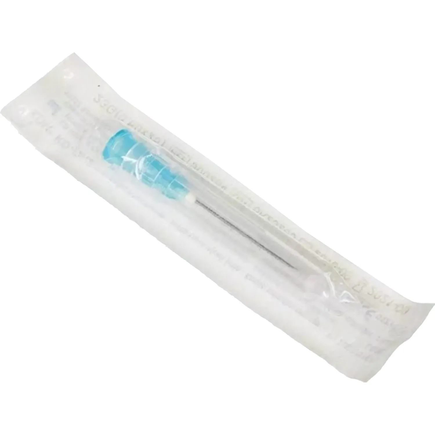 Игла имеет диаметр 0.6 мм и длину 25 мм, предназначена для одноразового использования. Иглы стерильны и произведены в Германии. Каждая игла упакована индивидуально. Срок годности: 5 лет.