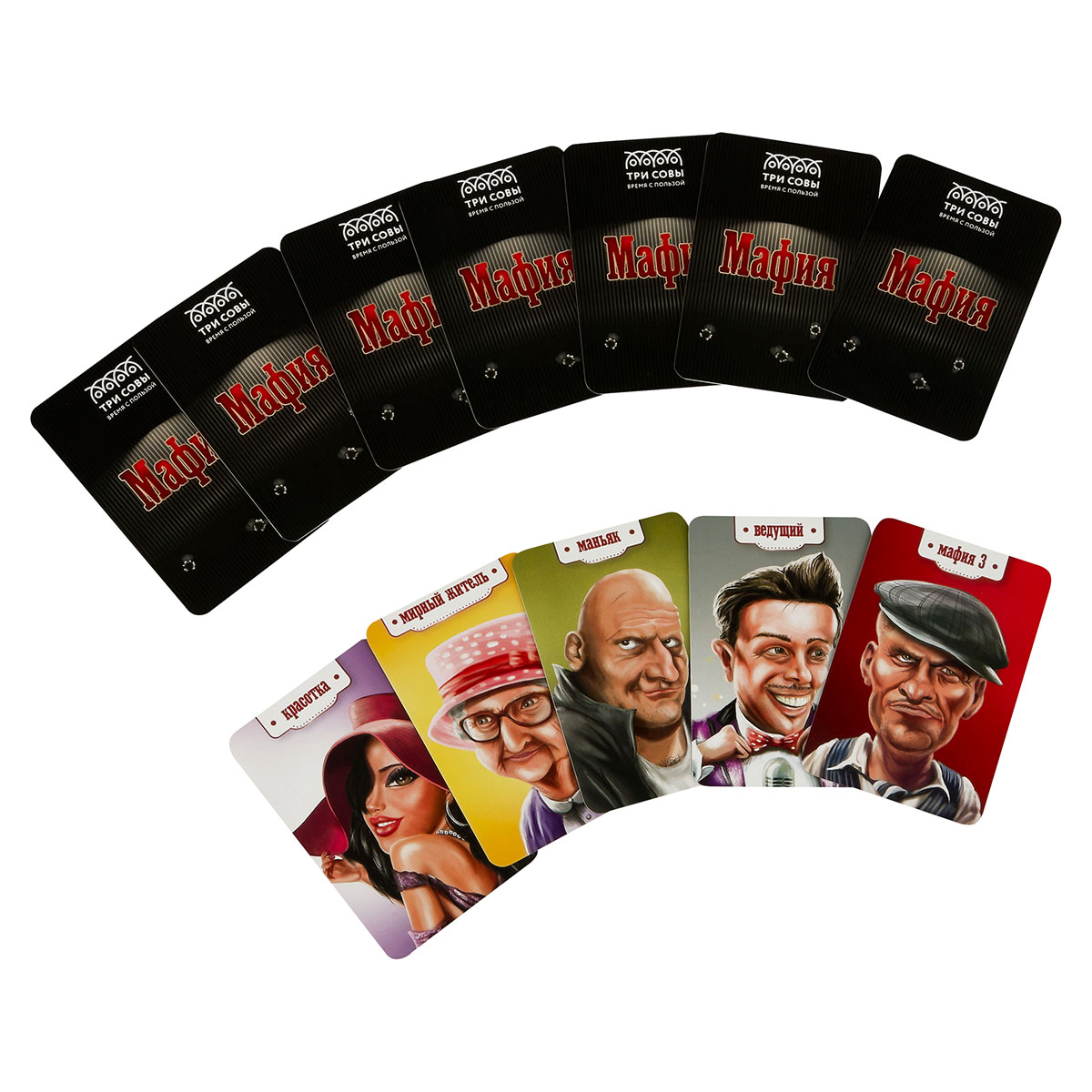 «Мафия» от бренда «ТРИ СОВЫ» – командная пошаговая ролевая игра с детективным сюжетом. В комплект входят правила игры и 14 карт: ведущий – 1, босс мафии – 1, мафия – 3, маньяк – 1, комиссар – 1, доктор – 1, красотка – 1, мирные жители – 5.