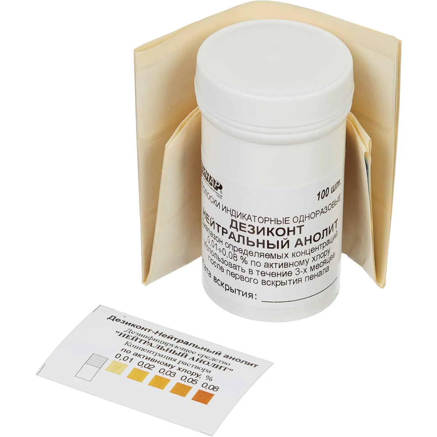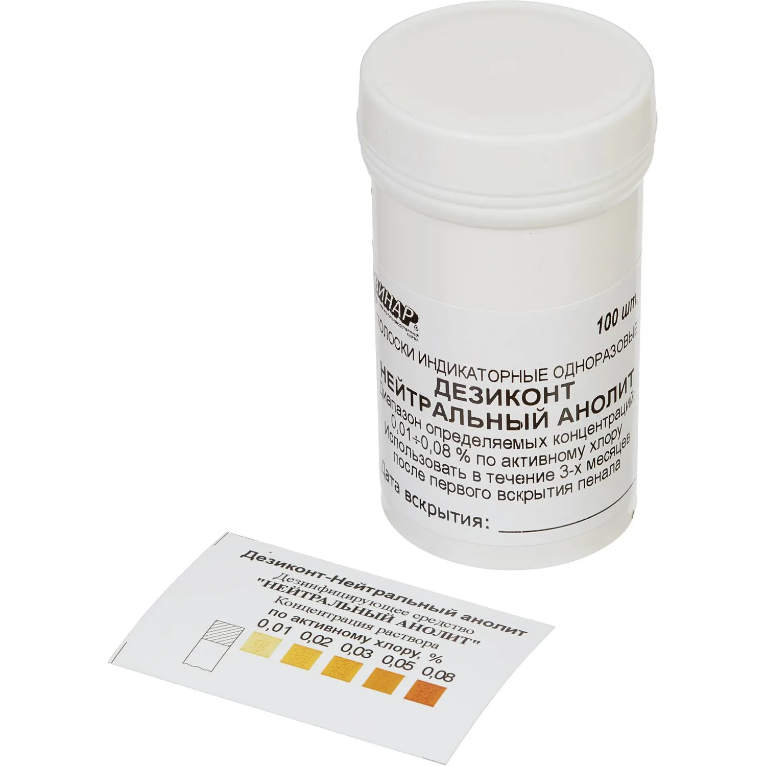 Индикаторные полоски экспресс-контроля концентраций рабочих растворов дезинфицирующего средства «Heйтральный анолит». Производство: Россия, ООО НПФ «ВИНАР». Назначение: предназначены для персоналалечебно-профилактических учреждений, работников дезинфекционной и санитарно-эпидемиологической службы, а также других учреждений, имеющих право заниматься дезинфекционной деятельностью. Фасовка: в комплект поставки входят: индикаторные тест-полоски на полимерной подложке (далее — индикаторные полоски); элемент сравнения: инструкция по применению; банка (пенал); упаковочная коробка. Применение: индикаторные полоски экспресс-контроля концентраций рабочих растворов нейтрального анолита, выпускаемые в соответствии с ТУ 9443-002-11764404-98, являются изделиями однократного применения и предназначены для визуального контроля растворов нейтрального анолита с концентрациями 0,01; 0,02; 0,03; 0,05; 0,08 по активному хлору, получаемых на установках типа СТЭЛ-10Н-120-01 и УМЭМ. В мерный стакан наливают не менее 30 мл контролируемого рабочего раствора нейтрального анолита комнатной температуры. Из пенала извлекают индикаторную полоску и погружают её индикаторной зоной в раствор на 5 секунд (по секундомеру). Затем полоску извлекают из раствора, удаляют с нее избыток жидкости, проводя ребром полоски о край стакана. Полоску кладут на фильтровальную бумагу индикаторной зоной вверх и выдерживают 1 минуту. После чего в течение не более 30 секунд сопоставляют цвет индикаторной зоны с цветовой шкалой элемента сравнения. Определение концентрации каждого рабочего раствора осуществляют 3 раза. В случае получения неоднозначных результатов определение содержания нейтрального анолита в контролируемом растворе необходимо провести методом иодометрического титрования. Срок хранения: 18 месяцев. Условия хранения: хранят и транспортируют в упаковке изготовителя при температуре от минус 15 °C до плюс 40 °C и влажности не более 80 при 25 °C, не подвергая воздействию паров химических веществ. Особенности и примечания: необходимо соблюдать указанное время выдержки индикаторных полосок в контролируемых растворах и на фильтровальной бумаге. Сопоставление цвета индикаторной полоски с цветовой шкалой элемента сравнения следует проводить только в условиях нормальной освещенности рабочего места при естественном или искусственном освещении.